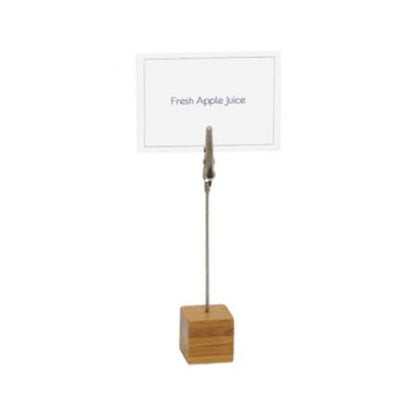 This clip is a unique way to display menus, signs, and more. It has a natural bamboo base with a metal clip. 1" x 1" x 5", 12 count.