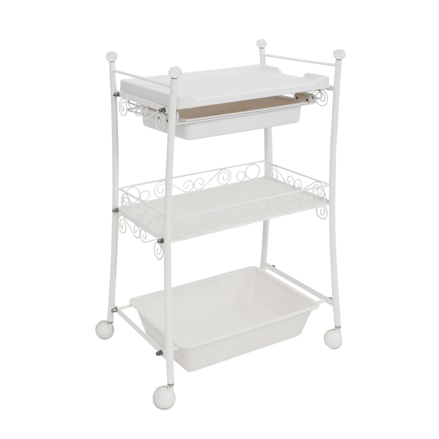 A place for everything! The Retro Esthetician Trolley easily accommodates tools and supplies for skin care, manicures and pedicures, and salon services. Functional and attractive, this mobile trolley will complement any treatment room, keeping everything you need at your fingertips. It has 3 storage levels: a top flat tray with drawer, a middle flat tray, and a bottom basket. White.Purpose and Benefits