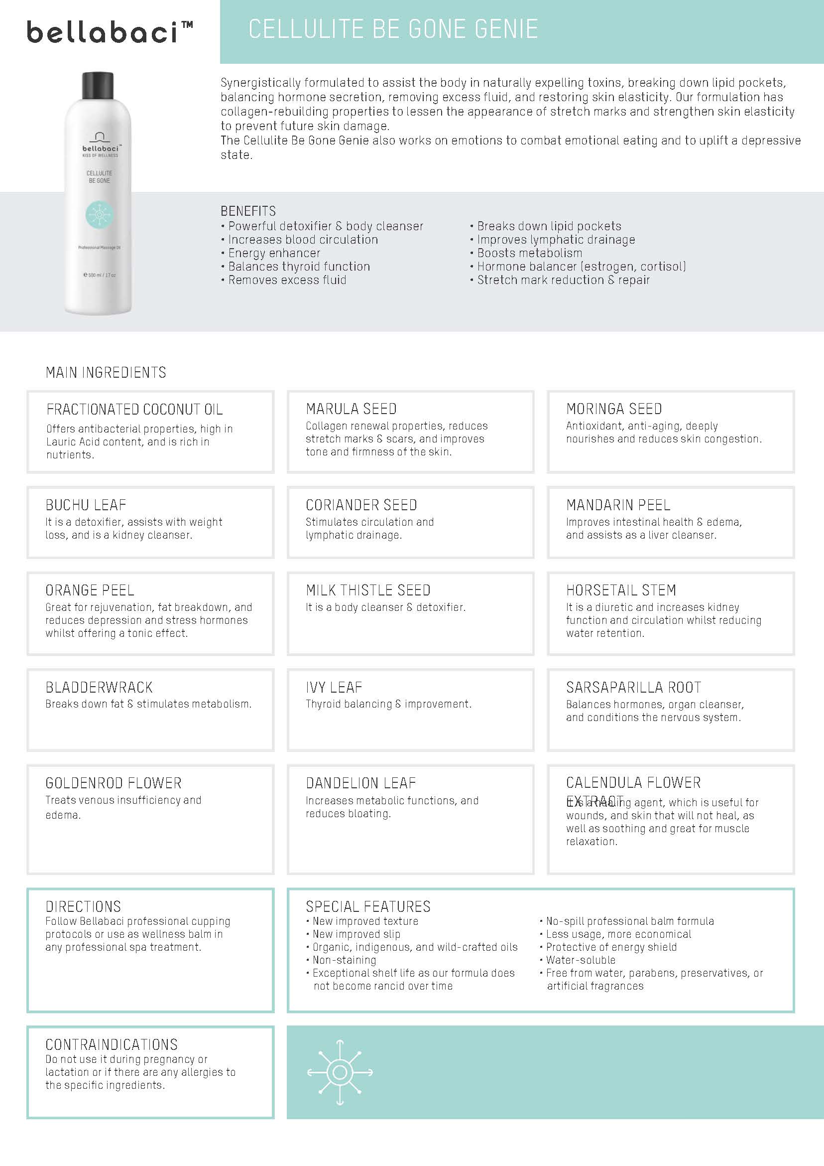 By incorporating Bellabaci's homeopathic formulas into your cupping, Swedish, or deep tissue massages, you're able to magnify the effectiveness of your treatments and get exceptional glide. Paraben-free. Certified cruelty-free and vegan by PETA. Beauty Without Cruelty certified.