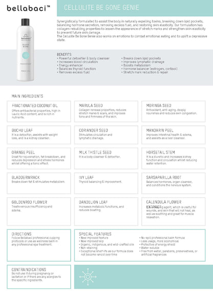 Fight the appearance of cellulite with the Bellabaci Cellulite Be Gone Professional Massage Oil. Treat the body to a skin-loving blend of coconut, moringa, marula, and citrus oils. Specifically formulated to lessen the appearance of stretch marks. Not suitable for pregnant or breastfeeding clients.