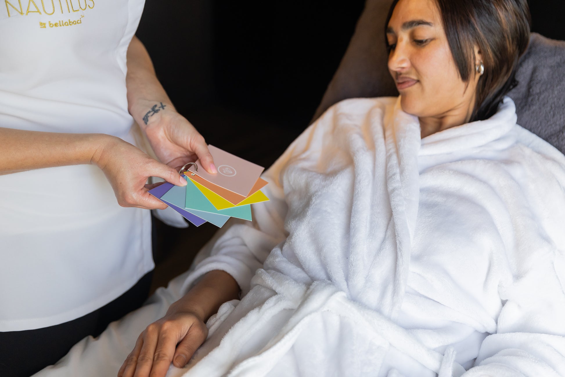 Therapists can use this card set to guide guests through the ritual. Each card color corresponds to a homeopathic blend. The color your guest chooses indicates their intrinsic need for that specific formula. It’s a very personal, meaningful way to begin any Bellabaci service.