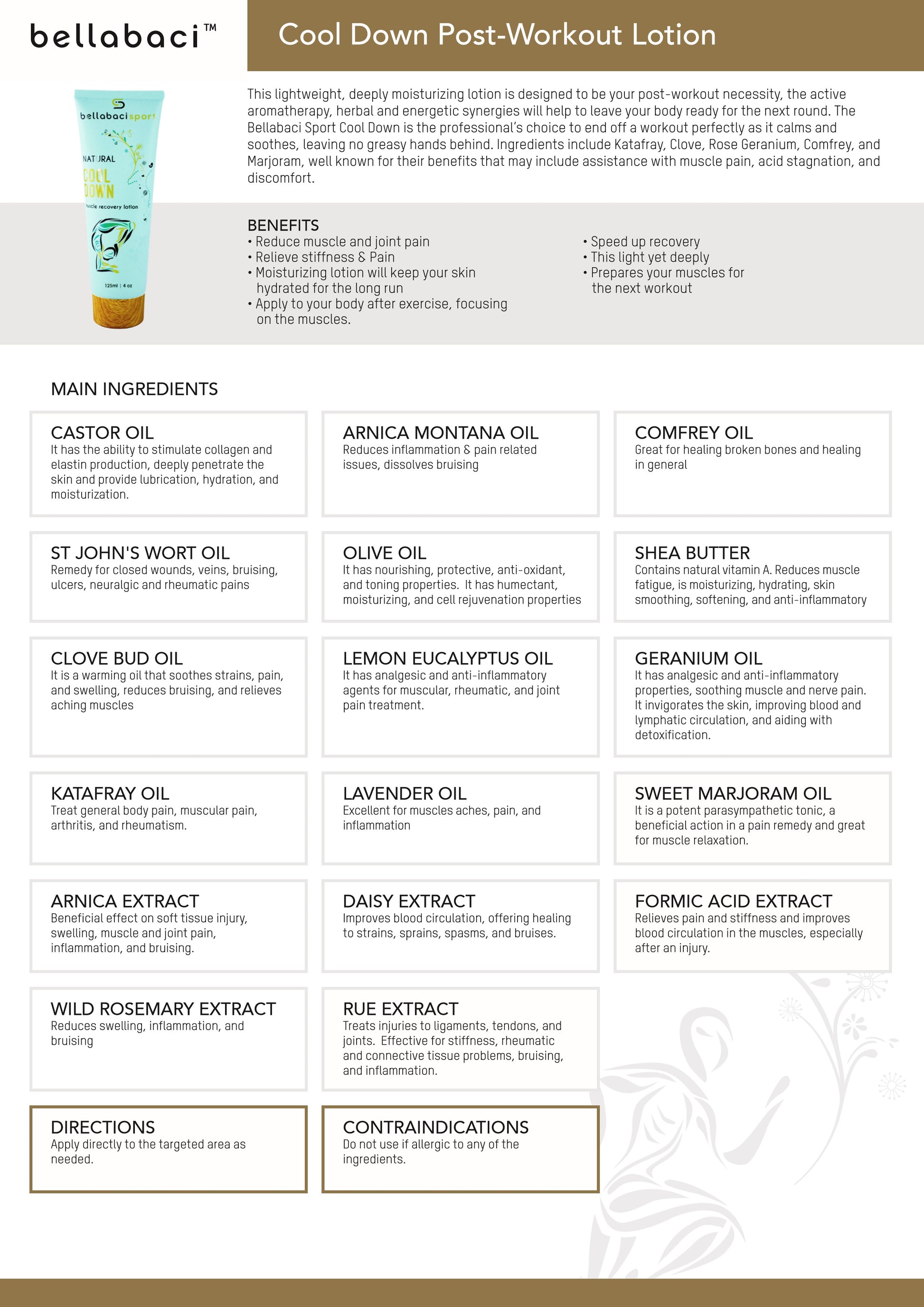 An excellent choice for coming down from the ultimate workout! Bellabaci Cool Down Post-Workout Lotion is the perfect choice for active clients. Its cooling properties make it ideal for post-workout targeted myofascial release and light deep tissue massage, aiding in the release of knots and tension. Specifically formulated with restorative botanicals such as comfrey, clove, and Labrador tea, it leaves no greasy residue on hands. May be used with the Bellabaci Massage Cupping System. Paraben-free. Beauty Without Cruelty certified and PETA certified cruelty-free and vegan. 4 fl. oz.