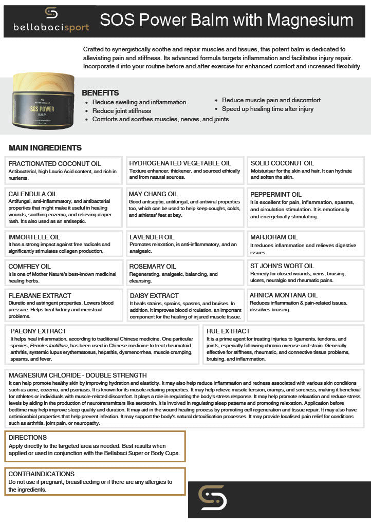 Offer your clients deep, soothing relief with SOS Power Balm, expertly formulated to ease tension and revitalize tired muscles. Its rich formula and ability to penetrate deeply make it suitable for deep tissue massage and myofascial release, assisting in the breakdown of adhesions and knots. This rich balm is infused with a natural muscle-soothing complex and magnesium, providing an immediate sensation of comfort and relaxation.