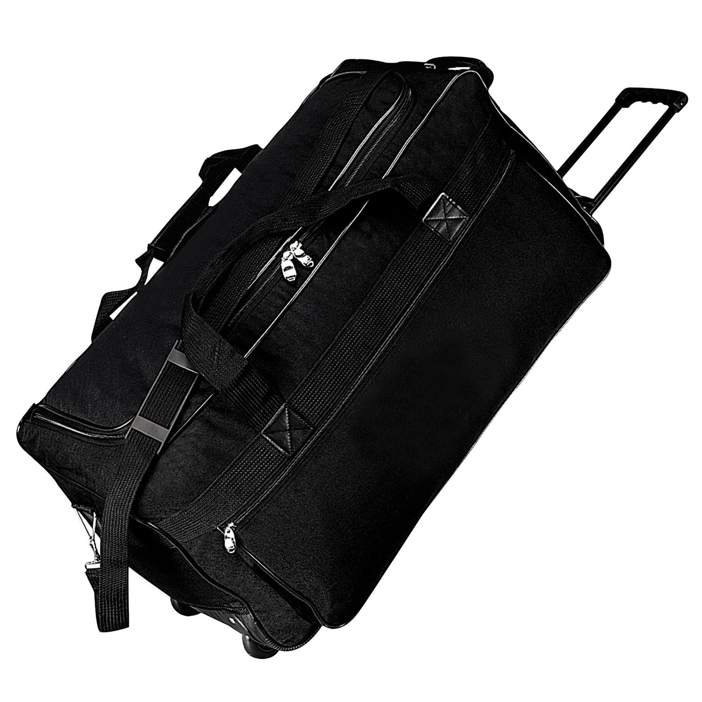 This wheeled duffle bag is ideal and handy for school kits. It features a zippered front pocket, two padded handles, dual inline skate wheels, and a T-shaped telescoping handle for easy maneuverability. Made from black polyester canvas, this roomy bag ensures durability and style. Dimensions: 25" L x 13" H x 11" D