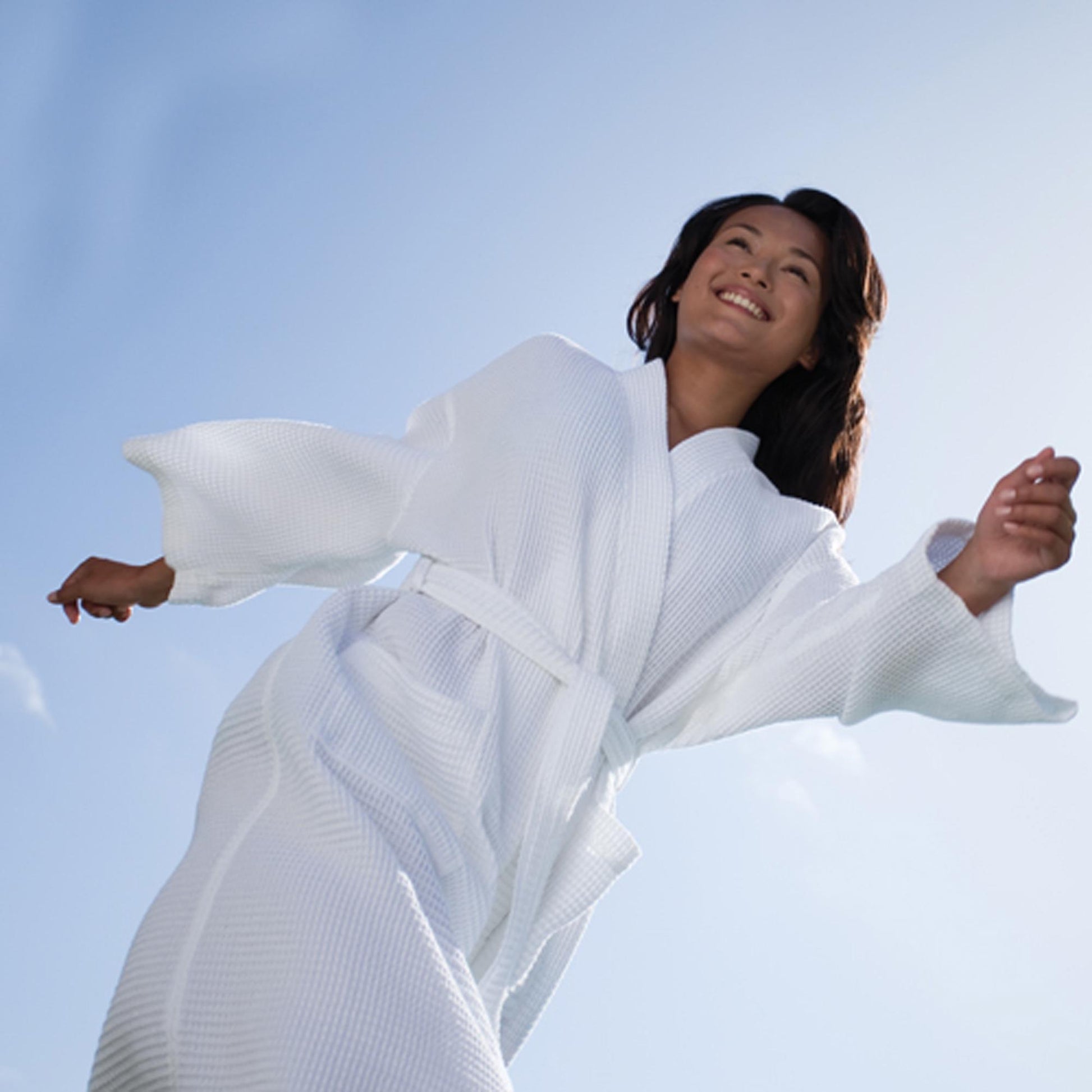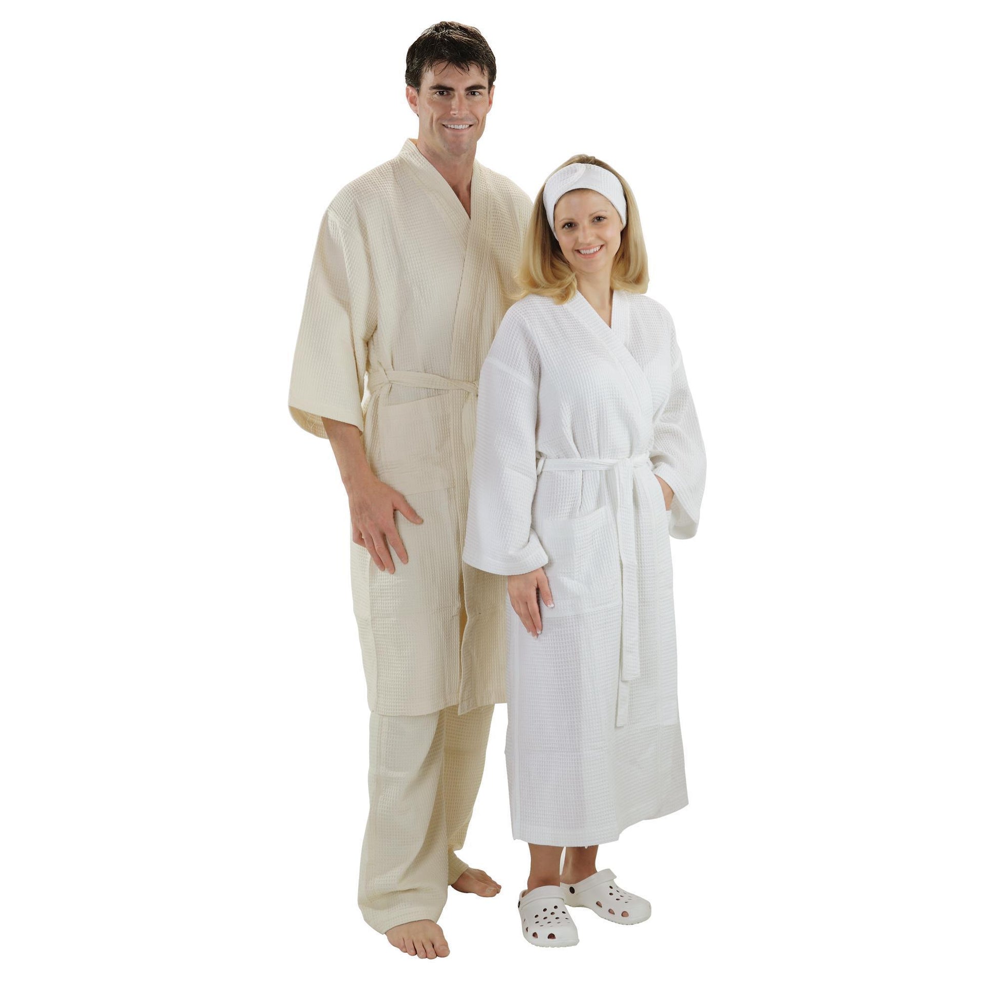 This waffle weave robe is made of a 67/33 blend of cotton and polyester that is comfortable and attractive, yet dries quickly and needs no ironing. It is lightweight and has full-length sleeves and two handy pockets.