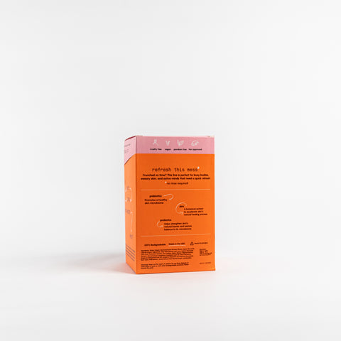 Certified cruelty-free by Leaping Bunny. Wipes are made of plant-based, biodegradable* cotton or a cotton/viscose blend. Each box includes 15 individually wrapped wipes in a ready-to-open display unit. Each wipe is 8" x 6"