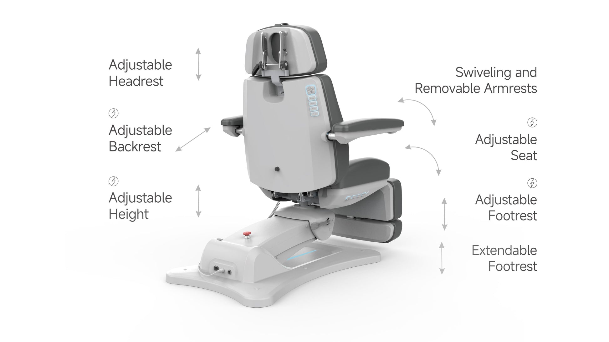 - 4 Electric Motors for Height, Backrest, Legrest, and Tilt adjustments