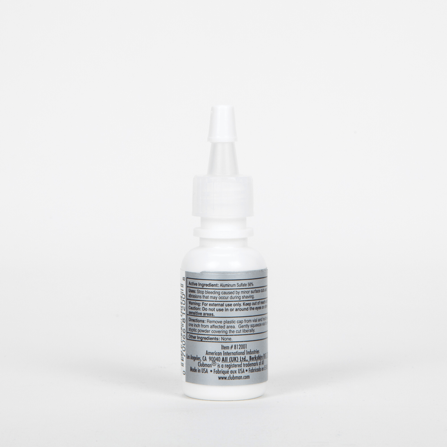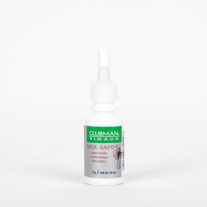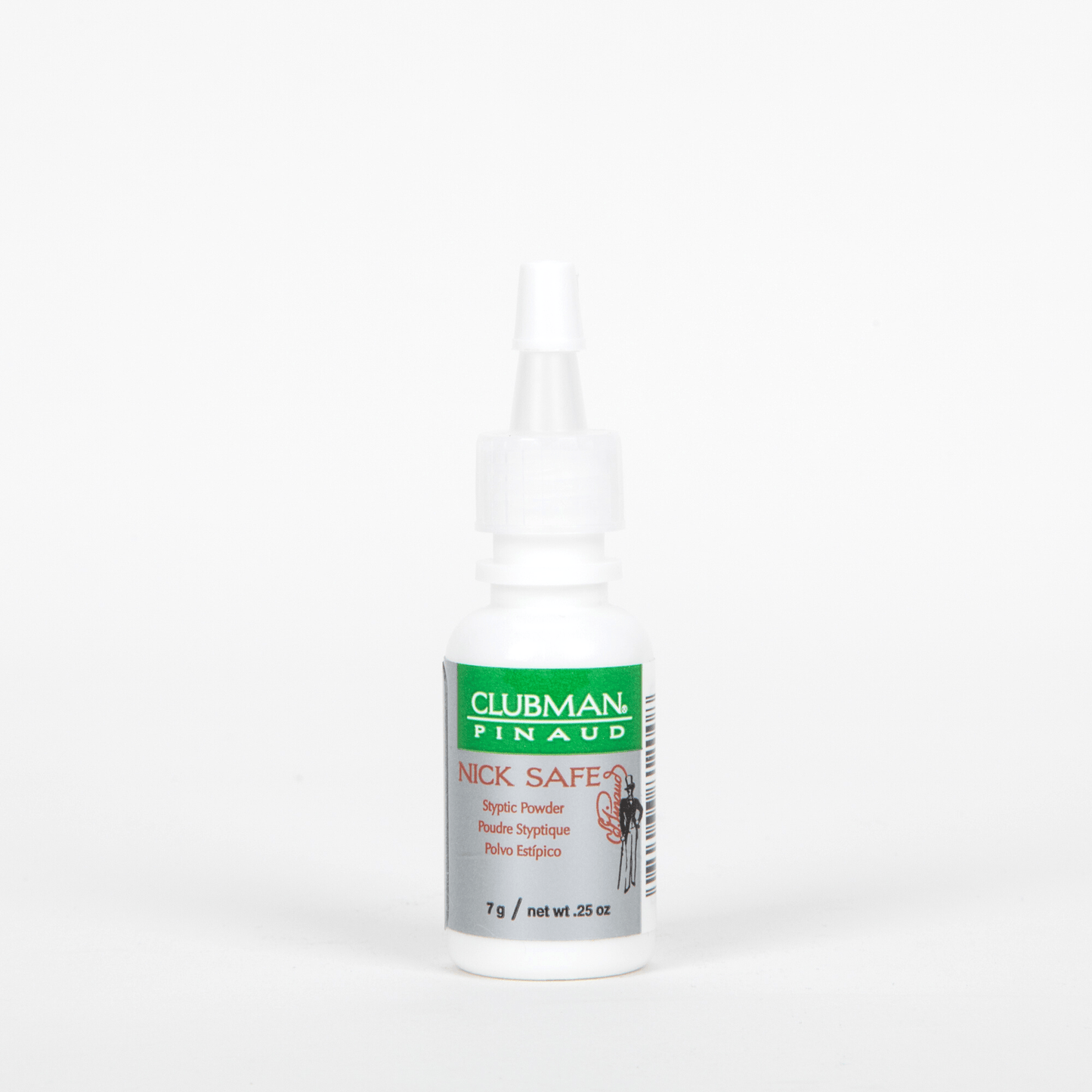 Clubman Nick Safe Styptic Powder stops bleeding caused by minor surface cuts and abrasions that may occur during shaving services. 0.25 oz.