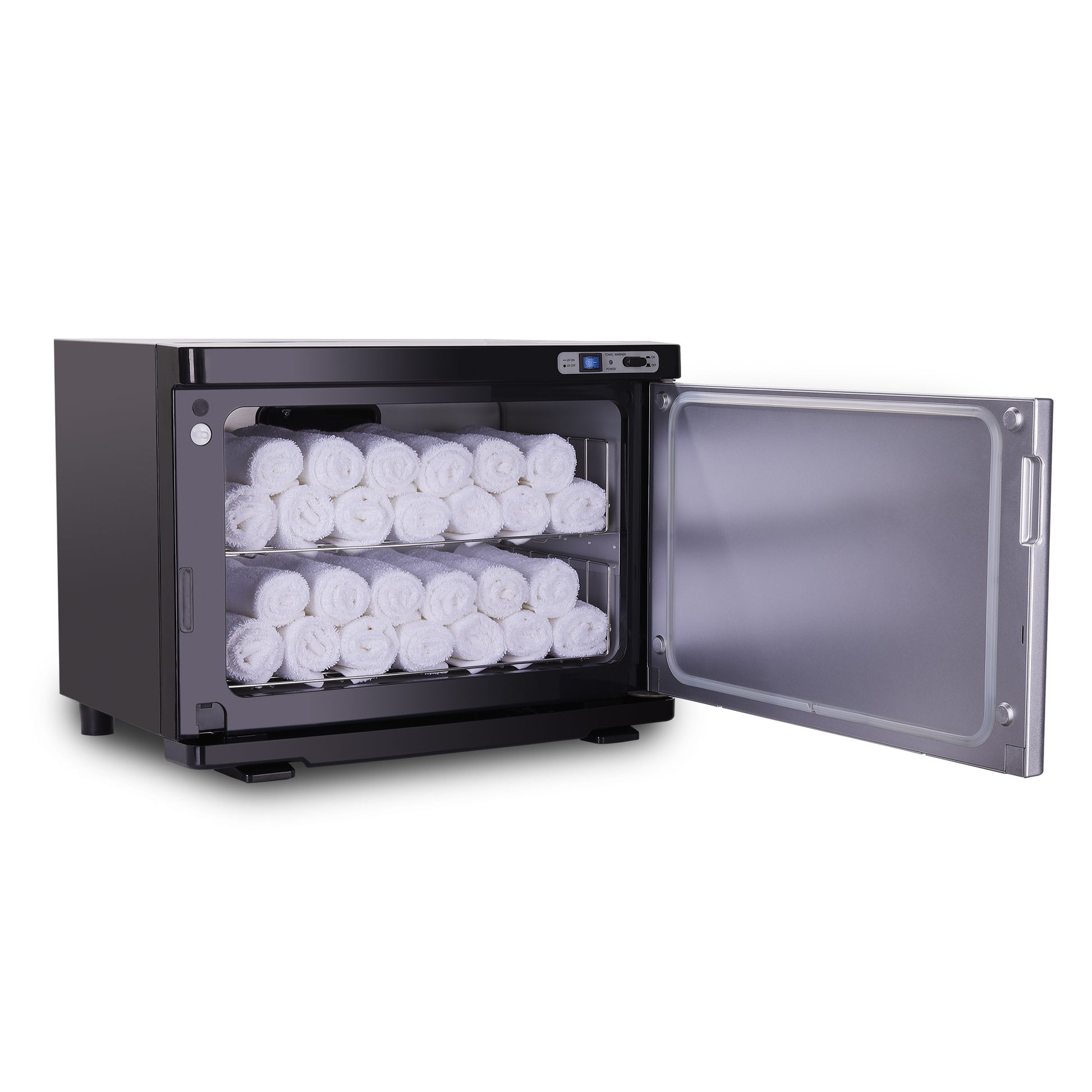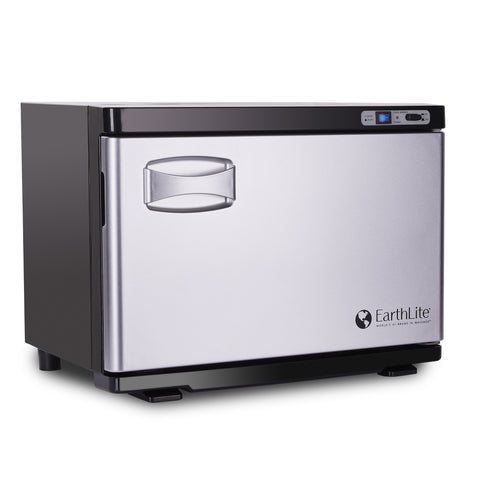 Consistently heat and sanitize your facial cloths or disposable towels throughout the day with the durable Earthlite® Standard Towel Cabi. Its sleek designed door includes sturdy hinges and easy-to-clean surfaces. Available in white cabinet with silver door or black cabinet with silver door to match any decor. This standard UV hot towel cabinet fits the Earthlite Elements trolley. UL® Listed.