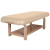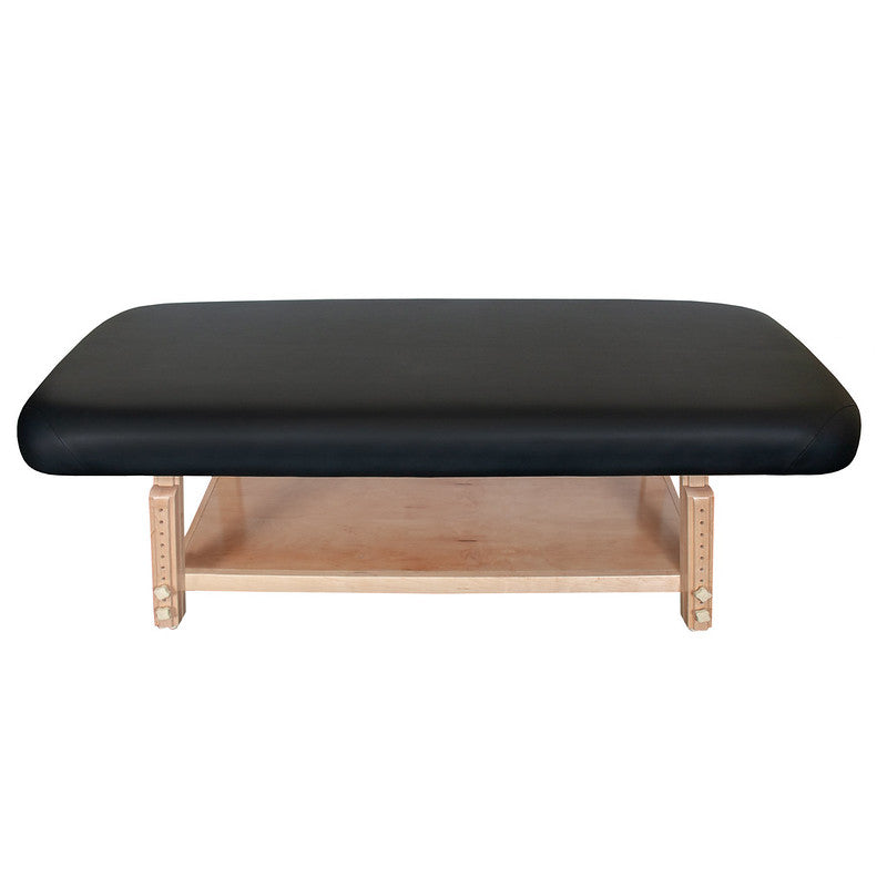 The sturdy TERRA™ stationary table features manual height adjustable legs, a sturdy hardwood frame and a luxurious deluxe adjustable facecradle and cushion. The TERRA is hand upholstered with deluxe 3” cushioning and the supple Nature's Touch fabric. A beautiful hardwood shelf offers plenty of storage space for linens and supplies.