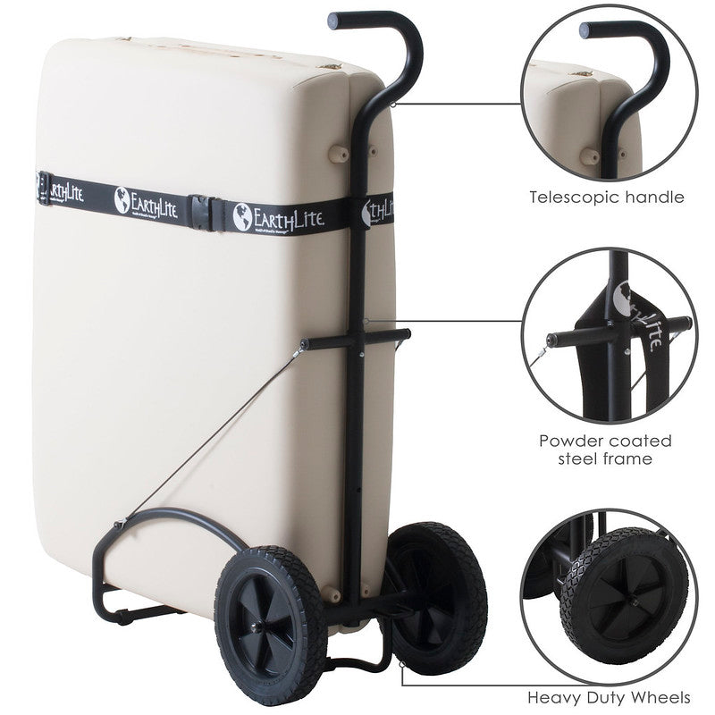 The Earthlite® Traveler Table Cart makes it easy to transport your treatment table, even over uneven surfaces! It features large wheels with slick precision steel bearings, which provide a steadier ride and more stable stair climbs. The steel frame provides a generous, protective base platform for your table.