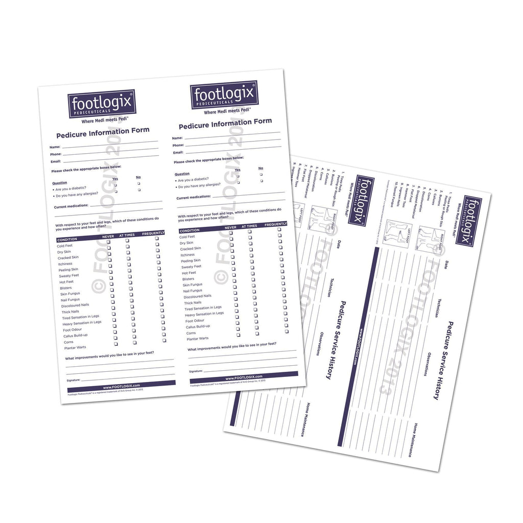 The Footlogix Consultation Pad asks questions relevant to a medi-pedi service and helps to differentiate from regular spa pedicure services. Reverse side pictogram of the foot with space to keep client records. 25 double-sided 11” x 4" sheets per pad.