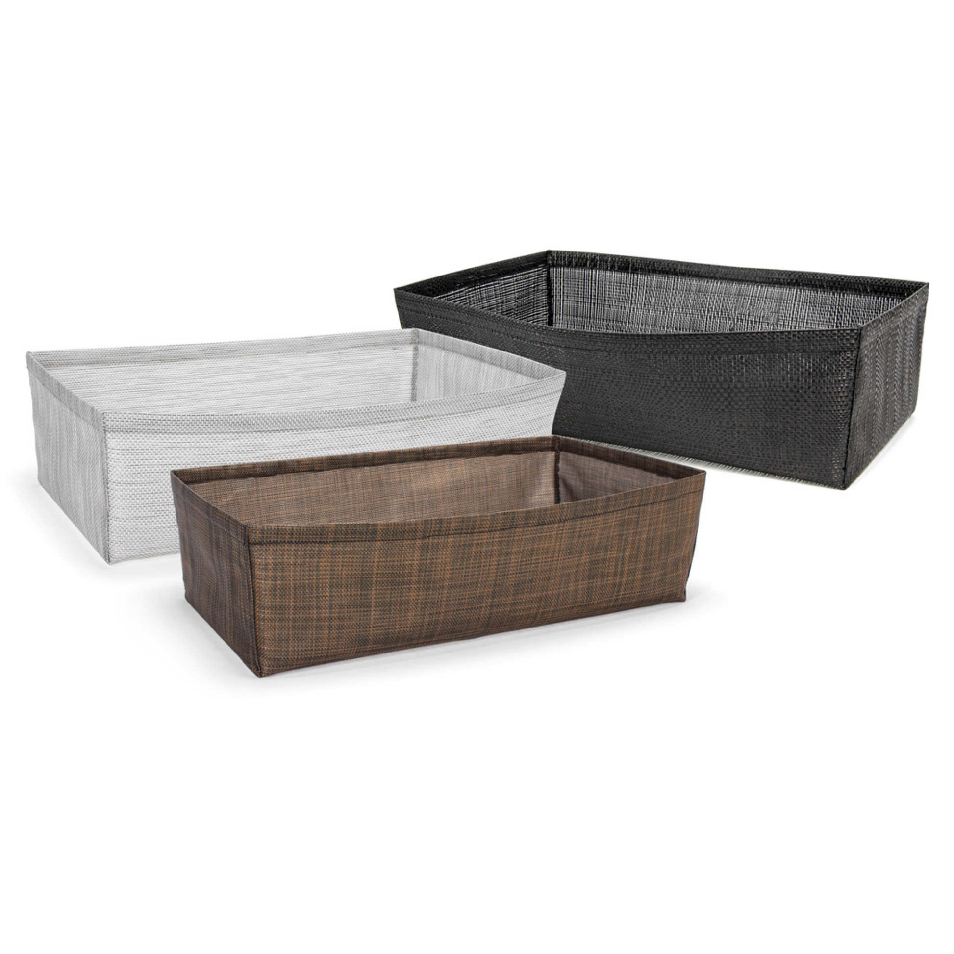 Create dynamic presentations with this woven vinyl basket. Perfectly portioned for a variety of uses, this artfully crafted item is bound to make an excellent first impression! Its beautiful woven construction adds an intriguing look and feel to your displays. Plus, its reusable design helps reduce waste caused by disposable alternatives. 20" x 12" x 5.75". 4 count.About the Collection