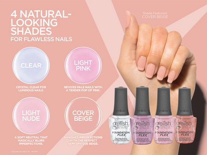 Gelish Foundation Flex virtually cocoons nails in a unique rubberized gel system. Nails are infused with supernatural flexibility making breaks and snaps a thing of the past! It works like a second skin for nails, plus offers instant volume and ultra-light, flexible protection with a barely-there feel. Light Pink: Revives pale nails with a tender pop of pink. Certified cruelty-free by PETA.