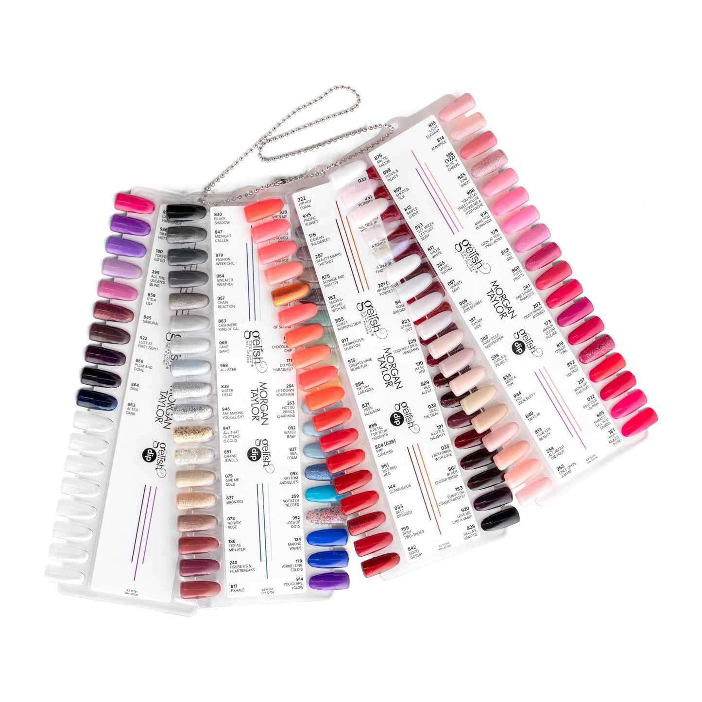 What sets this palette apart is its unique labeling system. Every shade is clearly marked, indicating its corresponding match in both the Gelish Dip and Morgan Taylor lacquer collections. This thoughtful feature is designed for seamless integration, allowing professionals and nail enthusiasts to effortlessly coordinate their nail treatments across different product lines