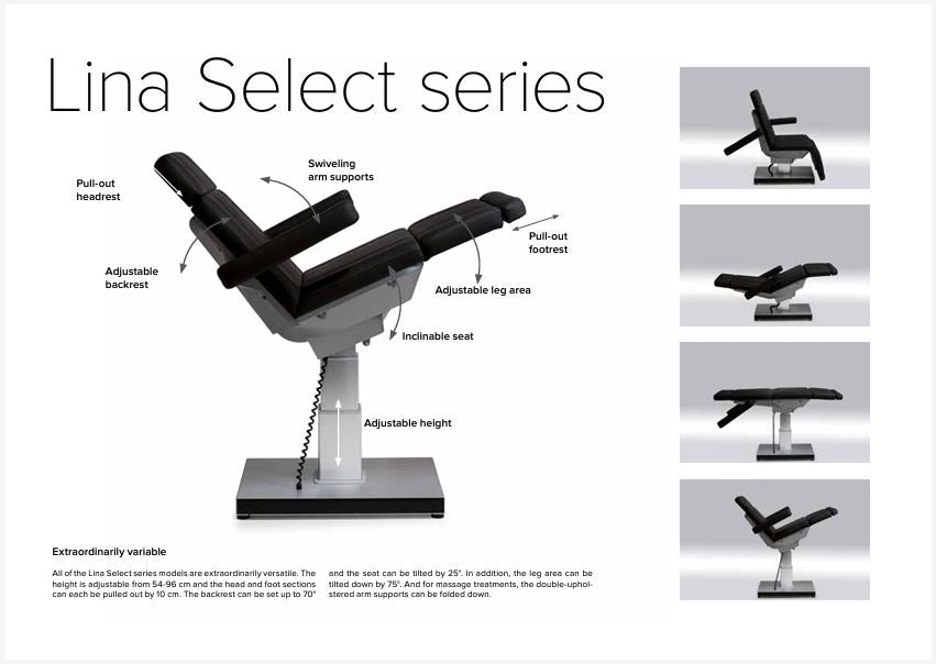 The elegantly designed Lina Select, with its numerous adjustment options, is the perfect treatment bed for most facilities. Standard with the Smart-Thermo heating system, Supersoft Upholstery, and Removeable Head and Footrest, it fulfills all needs and specifications in terms of appearance, comfort and practicality. Featuring electrically adjustable height, back, and seat via included hand switch.