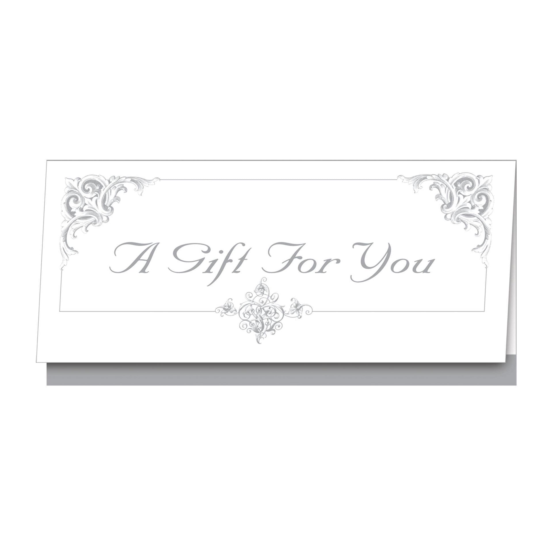 An elegant and practical gift solution that benefits your business and your customers. Silver Ornate Design. 6.25" x 3". 25 count.- Choosing a selection results in a full page refresh.