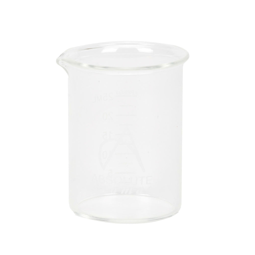 25 ml. This measuring beaker is the ideal size for blending essential oils. The glass composition of the beaker makes it non-permeable, avoiding the possibility of cross-contamination.