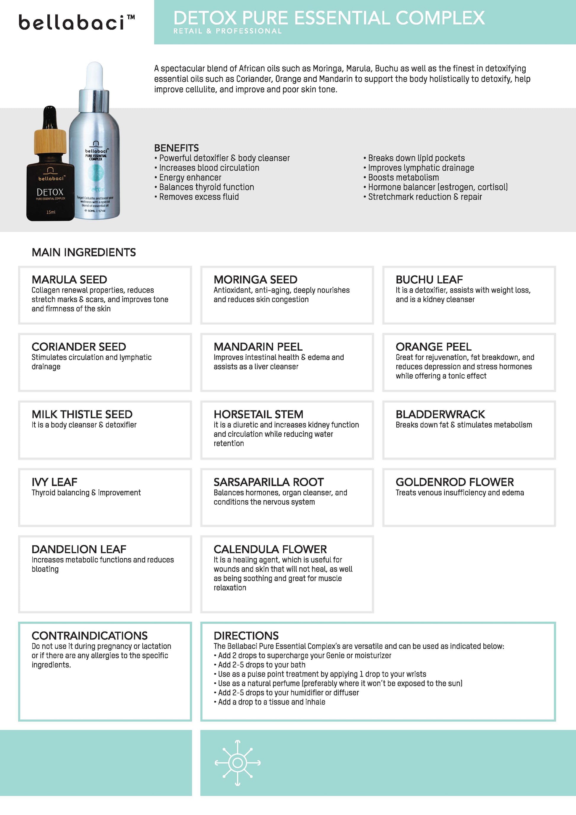 Detox Pure Essential Complex can also be added to your favorite carrier oil for massage or cellulite treatments. Also excellent for hydrotherapy treatments for an aromatic, therapeutic experience. Certified cruelty-free and vegan by PETA. Beauty Without Cruelty certified.
