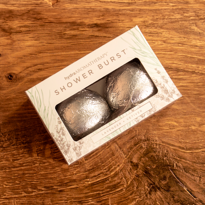 Each duo includes two handcrafted tablets infused with a calming blend of Lavender, Vetiver, and Copaiba Balsam essential oils. As steam activates the tablet, soothing scents fill the shower—helping melt away stress and restore balance.