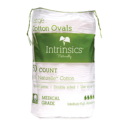 Use Intrinsics® 3" Cotton Ovals wet or dry during facials. Their quilt-like surface resists shredding, making them perfect for removing makeup or as eye pads. Double sided, medical grade, 100 percent cotton. White. 50 per bag. 2.5" x 3"Ingredients