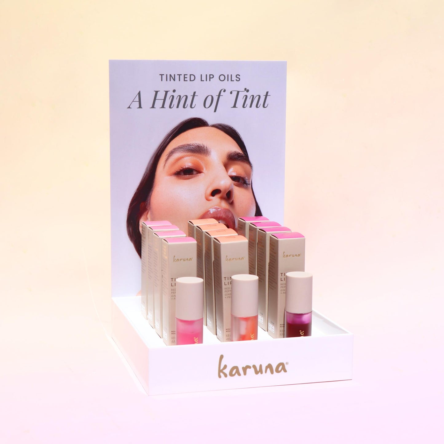 Effortlessly showcase your Karuna Tinted Lip Oils with this compact and functional display. Designed to encourage impulse purchases, it highlights all three shades with space to include a tester for hands-on customer engagement. Product sold separately.
