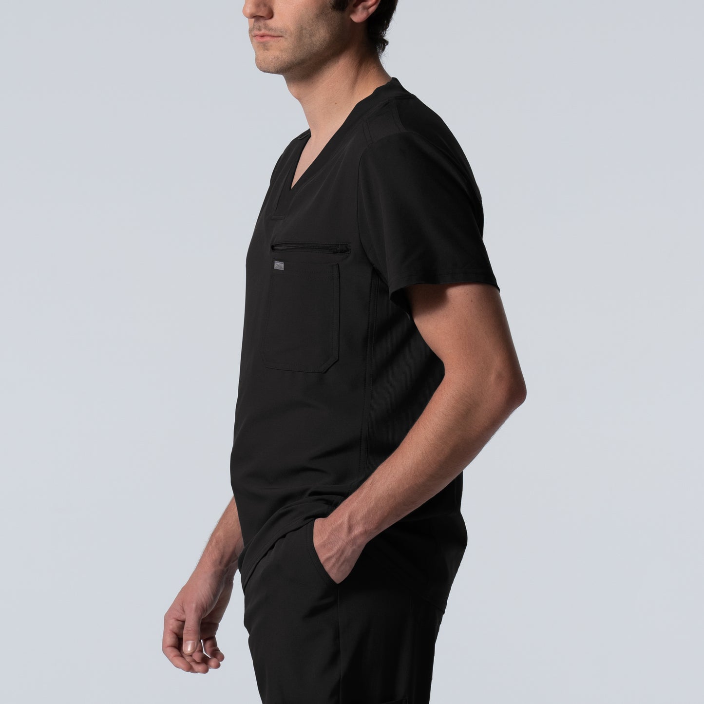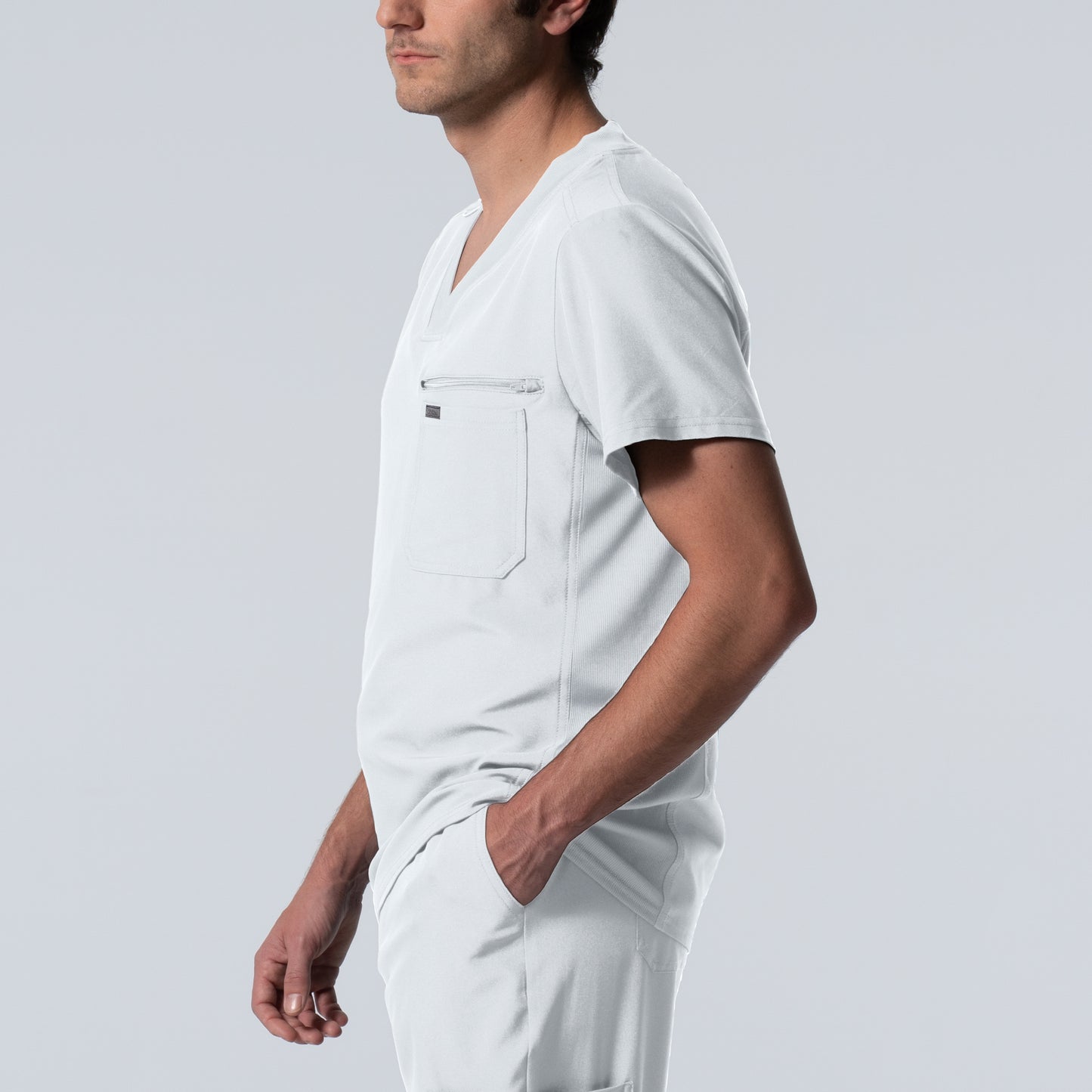 This Men's Fit, V-neck top has great features like a rib knit neckband and rib knit side panels that will give you a comfortable and sleek fit. With 1 zipper pocket to keep personal items secured, 1 separate patch chest pocket to store additional items and a ID badge loop.