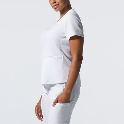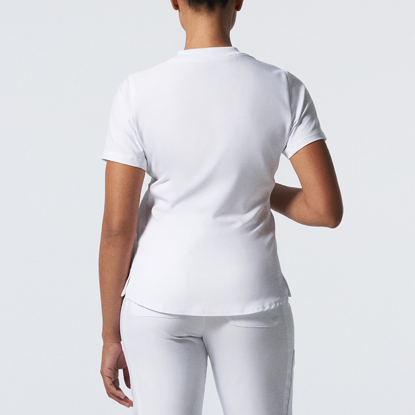 You will fall in love with this women's scrub top with its soft rib-knit side panels and neckband, which allow for comfort and ease of movement. Two front welt pockets and a badge loop provide plenty of storage and an on-seam zipper pocket keeps your items secure. Our modern tailored fit flatters your shape, while our moisture-wicking super stretch fabric provides the comfort and flexibility your work requires throughout the day.