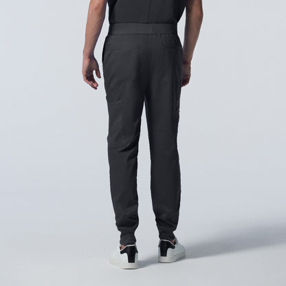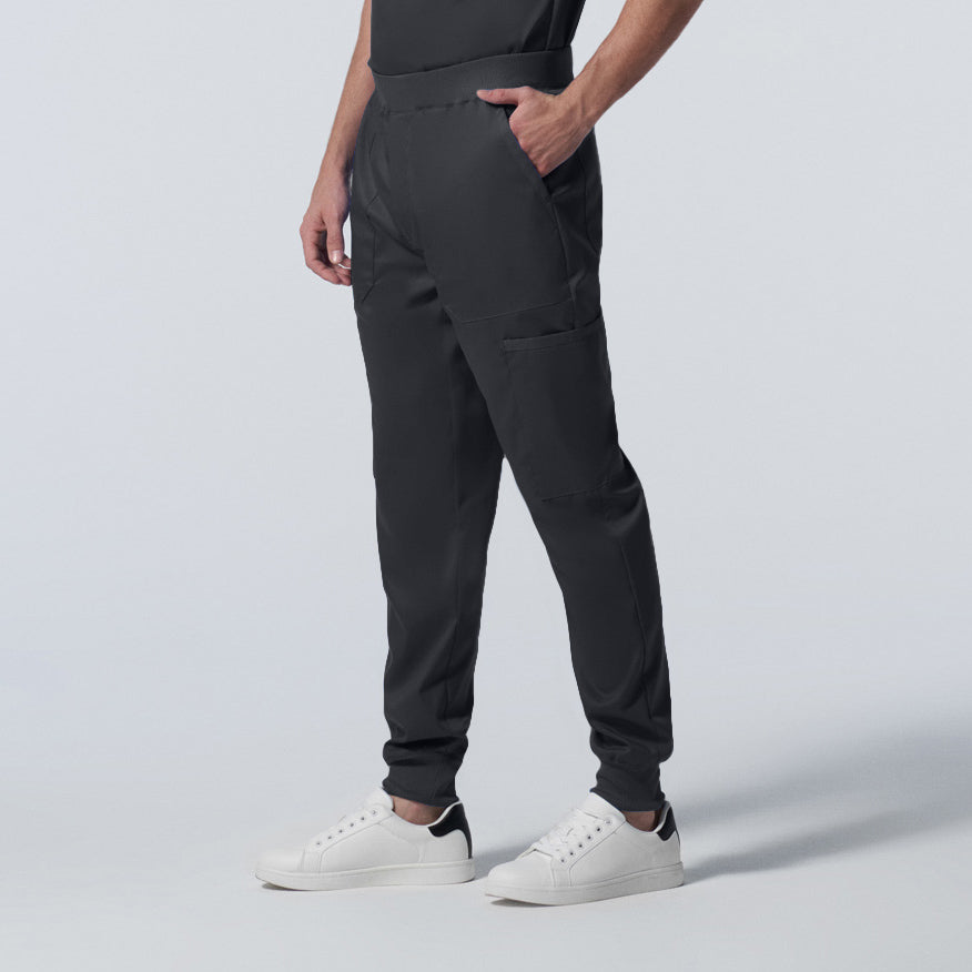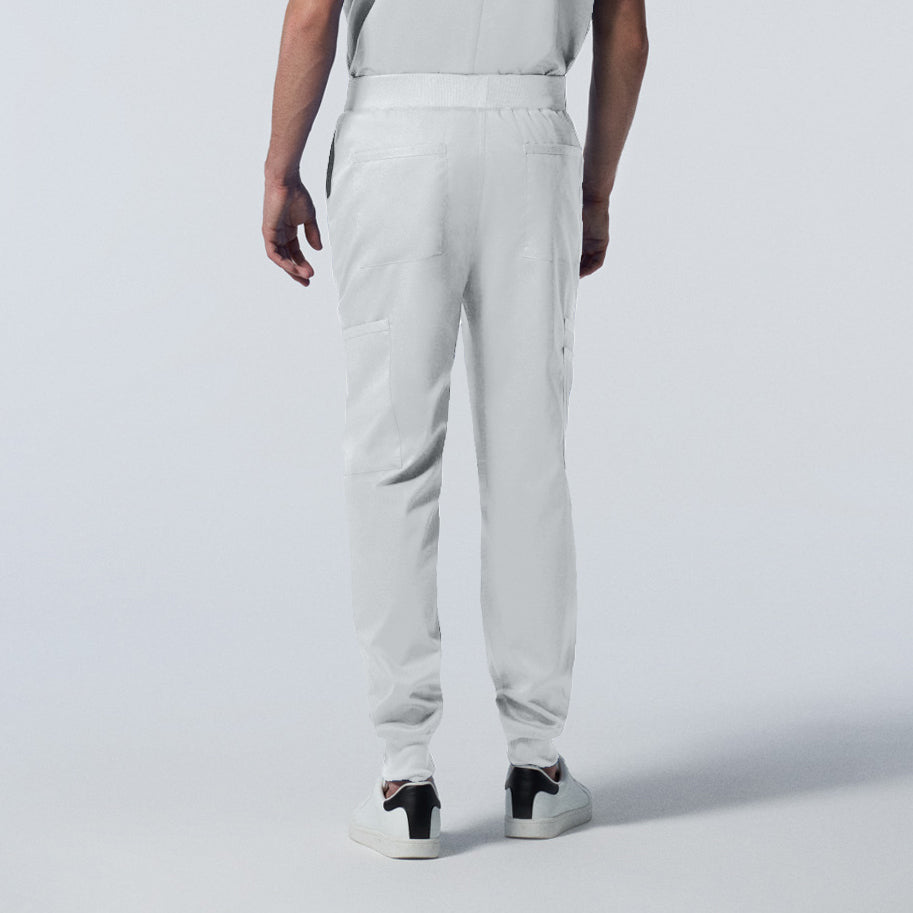 Men's Fit, zip fly jogger has a stretchy rib knit waistband with an internal drawstring. Rib knit bottom cuffs, 3 cargo pockets, 2 back pockets and 2 front pockets with 1 bungee loop to put your ID badge giving an easy access to instruments and accessories.