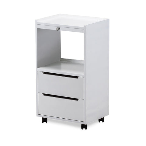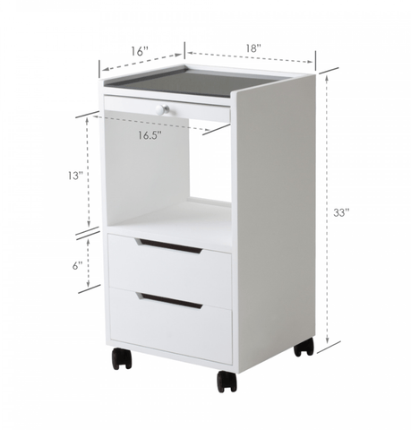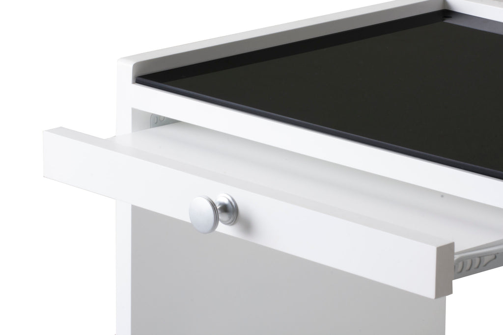 The Alpha Trolley Series is designed to provide your spa with simple, sturdy and affordable work stations. It features durable laminate finishes and 2 storage drawers to accommodate tall bottles, products and supplies. Alpha 2 also includes a convenient sliding breadboard shelf to increase the work surface. Alpha 2 features durable laminate finishes and 2 drawers and storage configurations. It is available in 3 colors; White Ash, Blonde Maple, or Midnight Black.