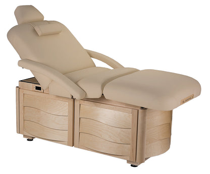The Napa Salon spa treatment table enables resorts to offer a full range of spa services virtually anyplace where power is not readily available. Smooth, quiet height adjustments are easily accomplished with the client on the table, with only a few revolutions of the sturdy fold-away handle. The versatile Napa™ Salon with its non-electric PowerAssist™ tilt option offers limitless possibilities at an incredible value. Using the pneumatic PowerAssist™ lever, a technician may adjust both the back and leg tilts to the perfect angle, infinite adjustability. Adjustments can be made with the client on the table, allowing you to provide massage, facials, manicures, and more — Its simple, elegant hardwood design will enhance any treatment room.