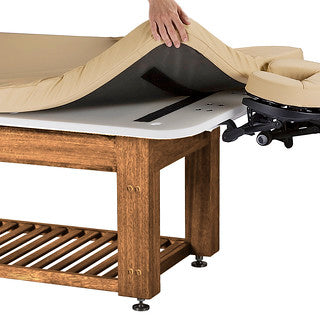 Non-electric height adjustments are easy and can be done while the client is on the table. Just a few revolutions of the handle and the Napa La Mer positions itself perfectly for several body treatments, including massage. Unlike other wet room tables, the comfortable upholstered top is designed to drain and can be removed for periodic disinfecting. At the end of their useful life, the foam and upholstery can easily be replaced.