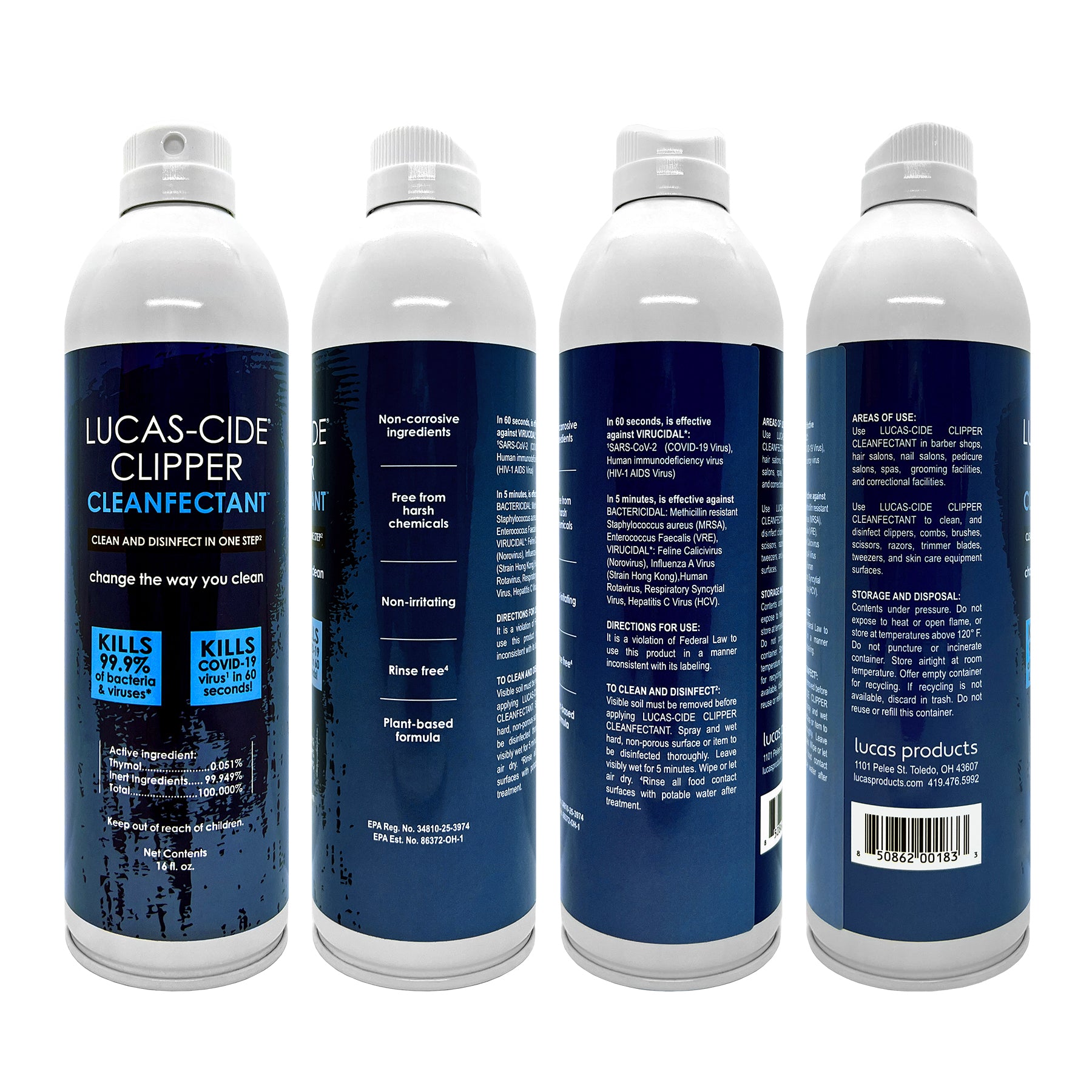 Areas of Use: Use Lucas-Cide Clipper Cleanfectant in barber shops, hair salons, nail salons, pedicure salons, spas, grooming facilities, and correctional facilities. Use Lucas-Cide Clipper Cleanfectant to clean, and disinfect clippers, combs, brushes, scissors, razors, trimmer blades, tweezers, and skin care equipment surfaces.