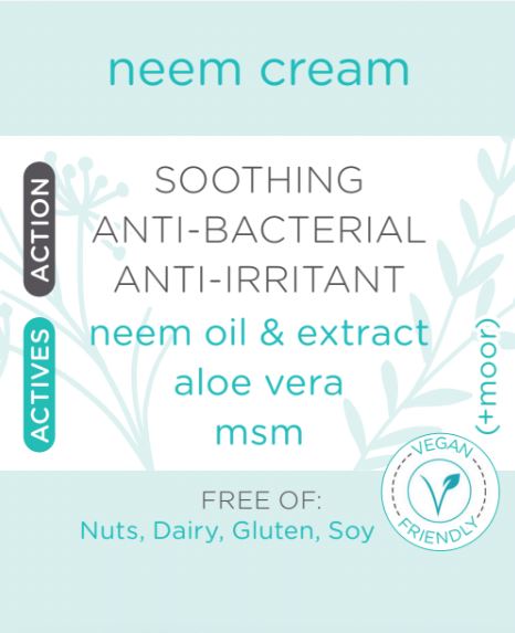 Aqua, Azadirachta Indica (Neem) Leaf Extract, Azadirachta Indica (Neem) Leaf Oil, Berberis Aquifolium (Oregon Grape) Extract, Symphytum Officinale (Comfrey) Root Extract, Dimethyl Sulfone (MSM), Aloe Barbadensis (Aloe Vera) Leaf Extract, Cetearyl Alcohol, Polysorbate 60, Heilmoor Clay, Macrocystis Integrifolia (Giant Kelp) Extract, Vitis Vinifera (Grape) Seed Extract, Glycerin, Citrus Grandis (Grapefruit) Seed Extract, Cetyl Alcohol, Acorus Gramineus Root/Stem Extract, Perilla Ocymoides Leaf Extract