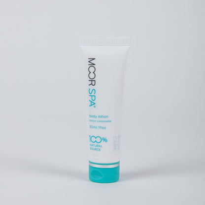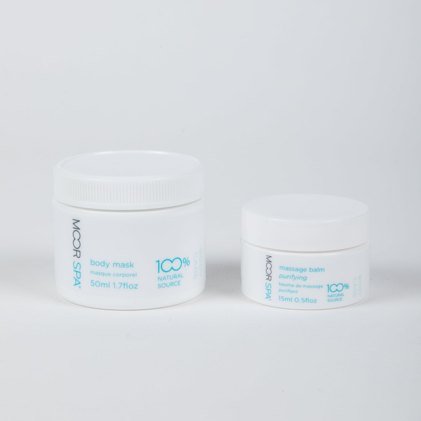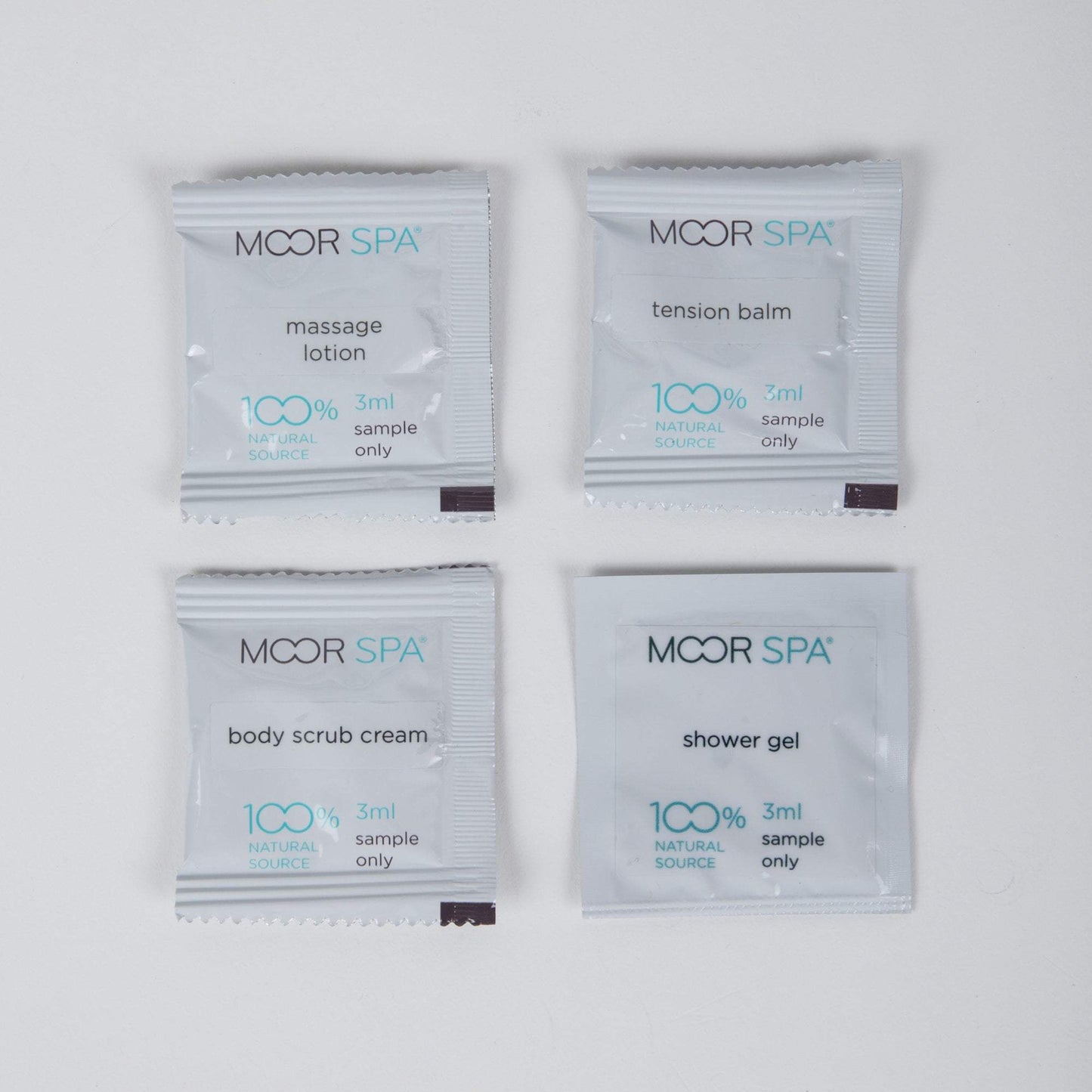 This sample kit contains a one-week supply of Moor Spa body care products, all packaged in reusable bag that measures 9.8" H x 5.9" W x 3.9" deep.