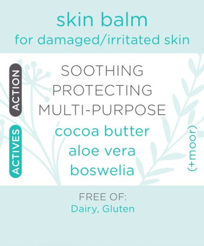 Provide moisture for very dry, damaged skin with Moor Spa® Skin Balm. This multipurpose skin repair cream is excellent for minor skin irritation, dryness, windburn, or sunburn. It’s ideal after microdermabrasion, laser treatments, peels, laser surgery, or waxing. Skin Balm is also great for insect bites, bruising, cuts, and stretch marks. The soothing formula combines moor, frankincense, and goldenseal in a rich base of aloe, cocoa butter, and shea butter. For damaged / irritated skin. Available in 1.8 fl. oz., 16.9 fl. oz. and 3 ml sample size.
