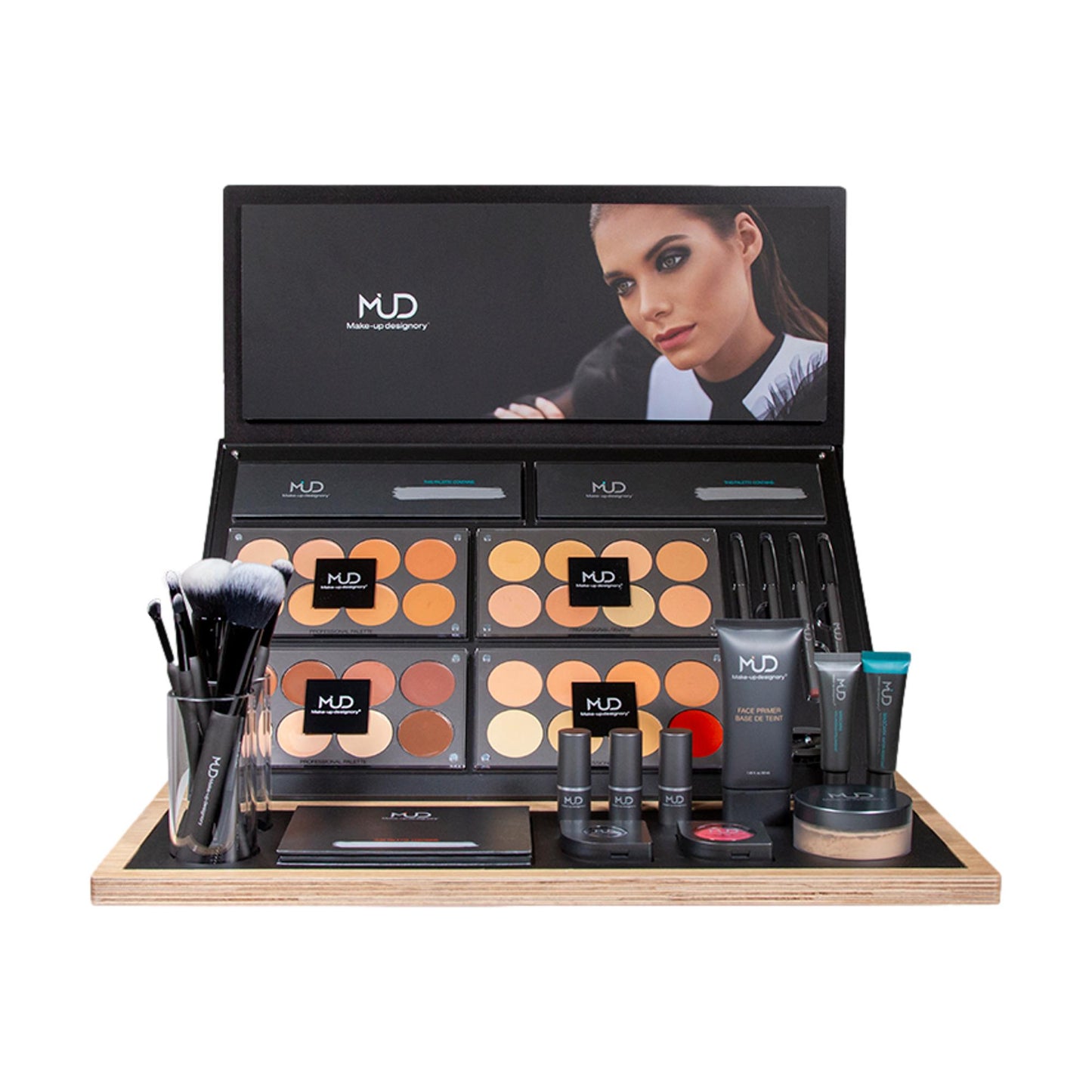 Elevate your artistry with the Beauty Station—a curated collection of essential tools and products designed to streamline your makeup applications. Inspired by MUD's Professional Collections, this elegant wooden display doubles as a stunning visual showcase and a fully equipped makeup kit. 19.6"L x 16.9"H x 15.7"W