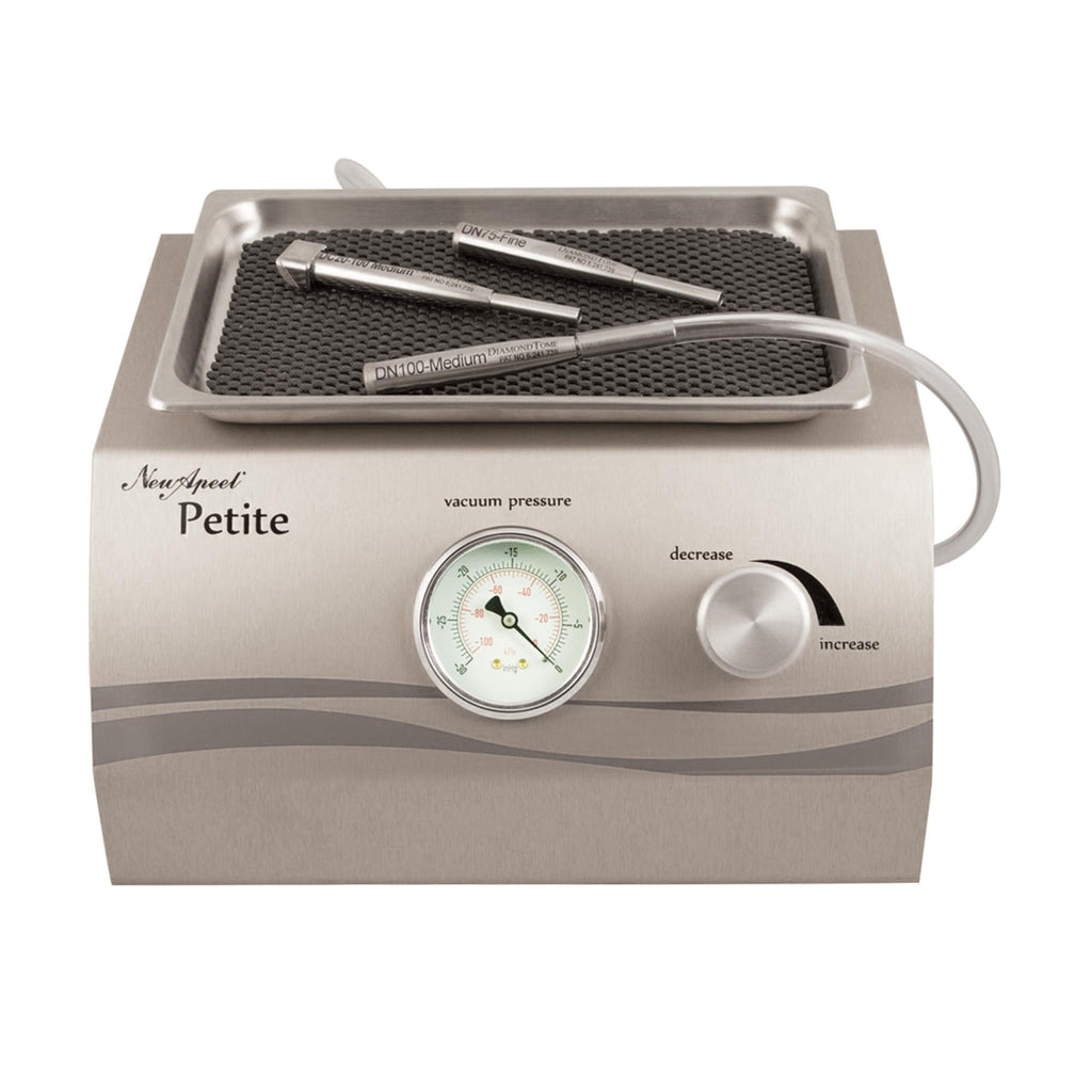 Leave clients’ skin feeling supple and vibrant with the NewApeel® Petite Exfoliation System by DiamondTome®. This compact system embodies performance, quality, and affordability. Using the patented DiamondTome® wand, the treatment is a safe, therapeutic approach to smoother, more youthful looking skin. The NewApeel Petite may be used on the face, neck, chest, hands, back, legs, elbows, and feet, making it extremely versatile. Treatments are non-invasive, pain-free, and require no downtime. Silver. CSA. System includes: Console, 1 DN75 Fine Face Wand, 1 DN00 Medium Face Wand, 1 DC20-100 Medium Body Wand, 2 Tube Set, 100 Filter Disc, HEPA Filter, Enzymatic Solution, Tweezers, Brass Brush, Training DVD, 50 Patient Brochures, Waiting Room DVD, Power Cord.Purpose and Benefits