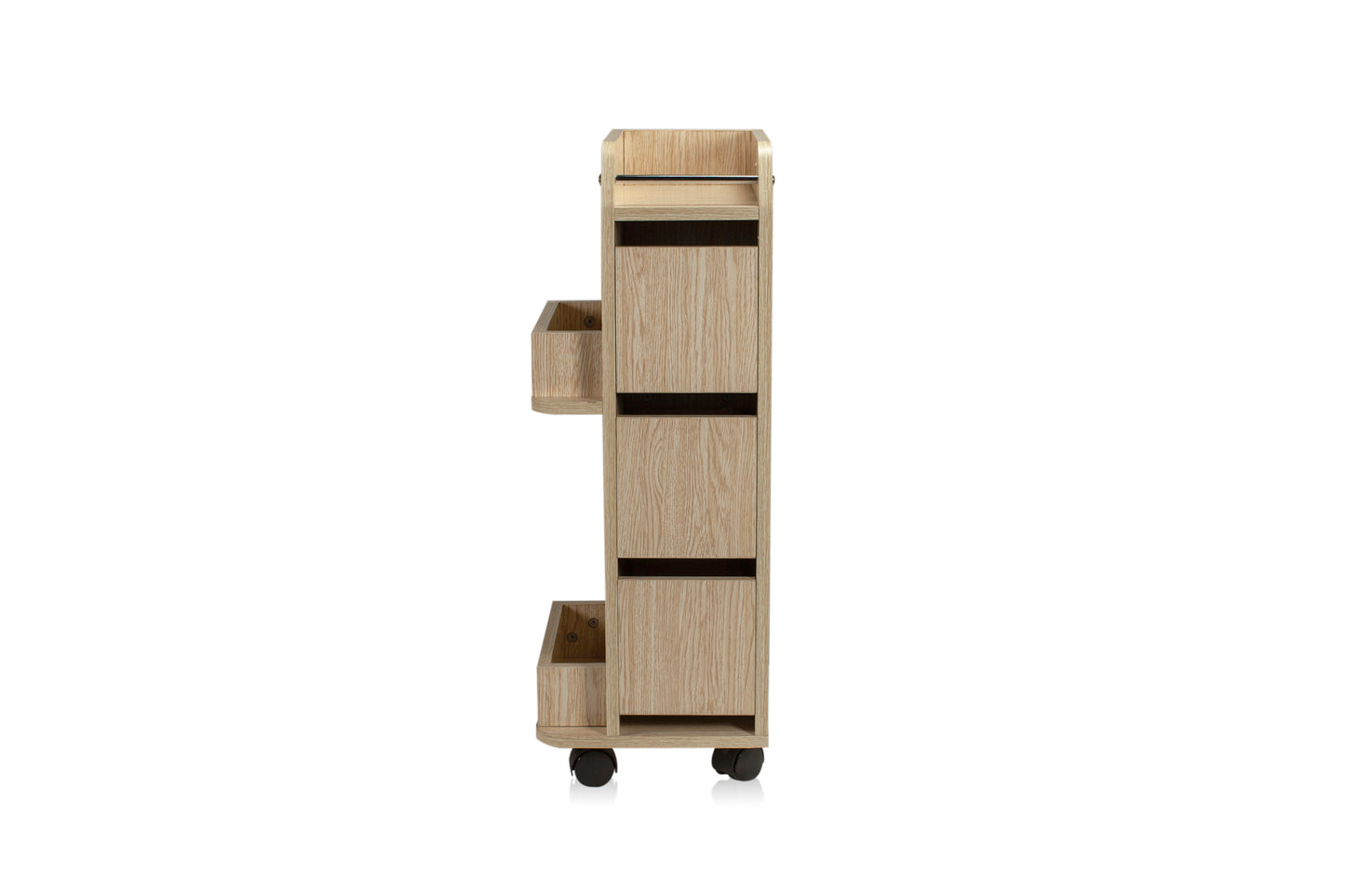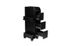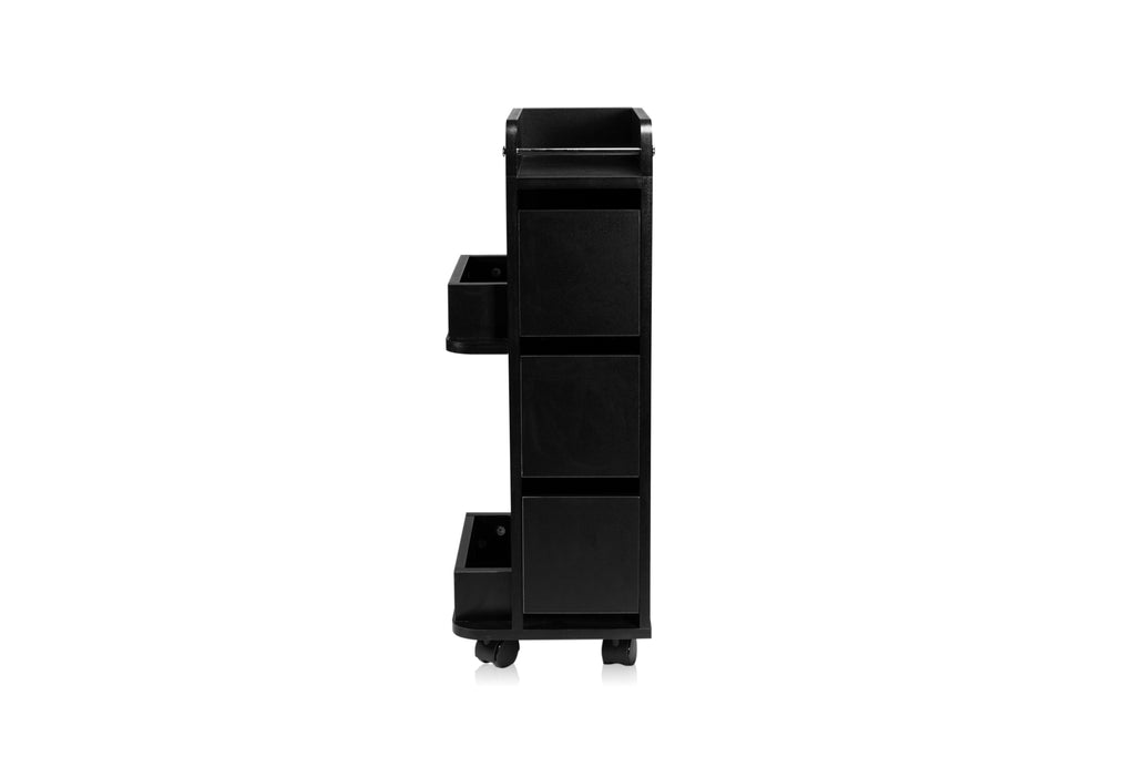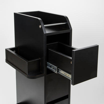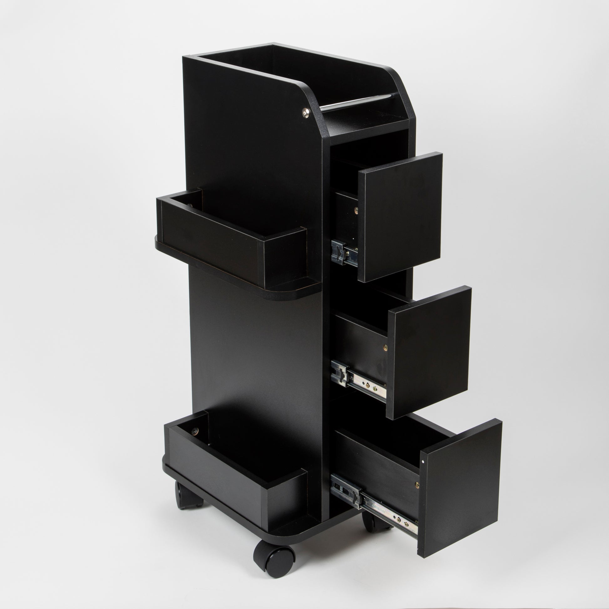 This pedicure trolley features side trays that hold most acetone or lotion bottles, three drawers, and a compact design to fit between two spa chairs. This trolley is the same height as most nail tables. Dimensions: 11" W x 14" D x 31.25" H