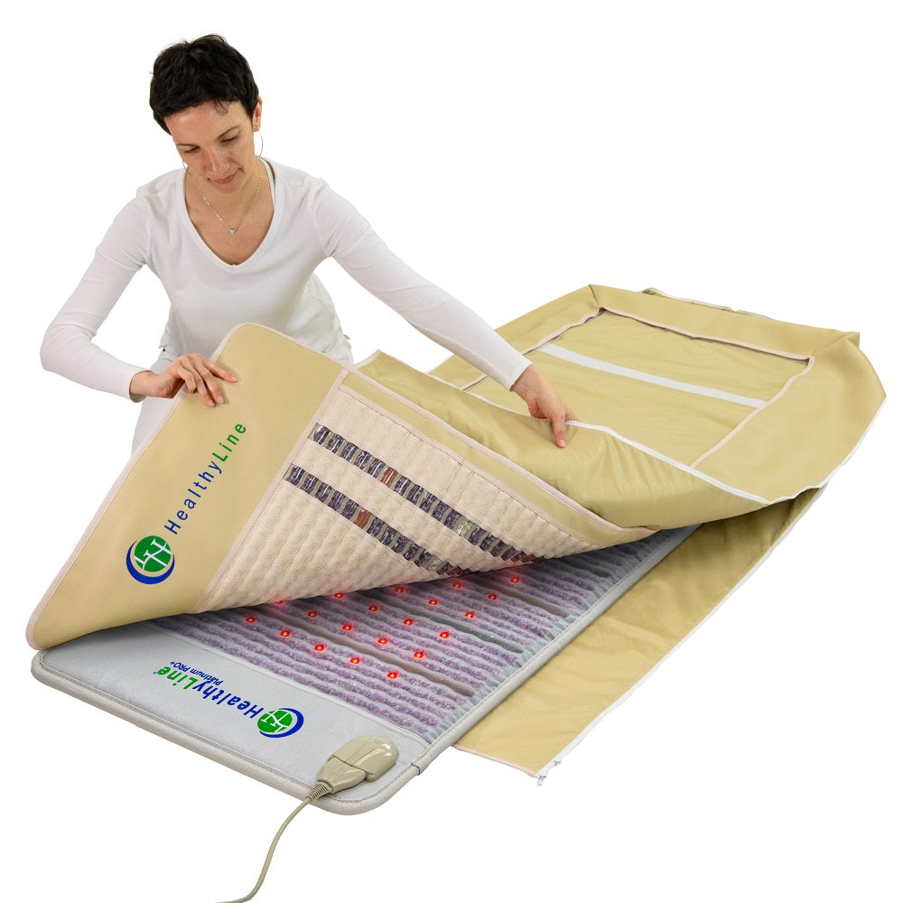 The 360 Wrap series is the newest innovation in our gemstone technology that gives the user exposure to the most comprehensive full-body experience to date. The product consists of two full-sized mats, the Platinum to act as a base and the SOFT to wrap around your body. Both mats have a Velcro lining along their edges so that a third piece can act as a lining that connects them. On top of the standard benefits of each mat, once connected, the user can climb in-between the two heated gemstone surfaces and enjoy an all-encompassing 360° deep penetrating experience. Relax in the presence of far infrared rays, negative ions, photon lights, and pulsed electromagnetic field therapies. Undergo expedited detoxification and joint pain relief with minimal effort. Feel the tension escape your muscles as your energy levels rapidly replenish. Each mat comes with its own controller so that you can change the temperature of each to customize the experience to your liking. The perfect device for professional spas to elevate their services to the next level is almost ideal for personal at-home wellness management. Try a 360 Wrap model today and feel unparalleled euphoric relaxation and pain relief.