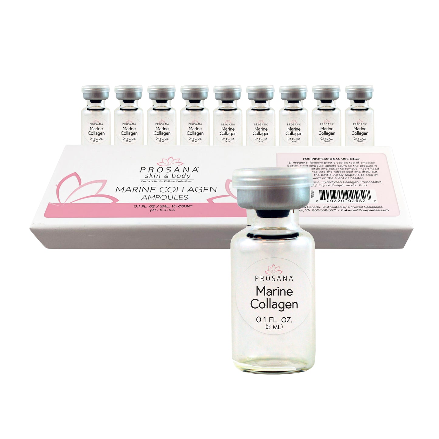 Revitalize and plump skin with Prosana Marine Collagen Ampoules. Collagen is a vital component of healthy skin, but it naturally declines with age. Marine collagen is the most bioavailable form of collagen; it absorbs more quickly and easily than all other types due to its molecular weight. Best if used with a sterile syringe. Cruelty-free. 10 x 3 mL size bottles. pH: 5-5.5