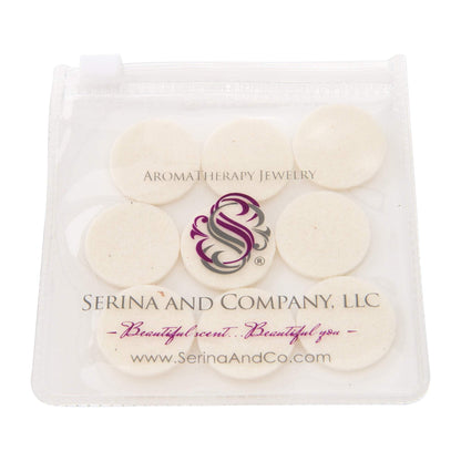 Clients want to change scents in their Serina and Company aromatherapy jewelry? It's easy with these Round Replacement Pads. This package contains 9 washable / reusable wool pads. White.- Choosing a selection results in a full page refresh.