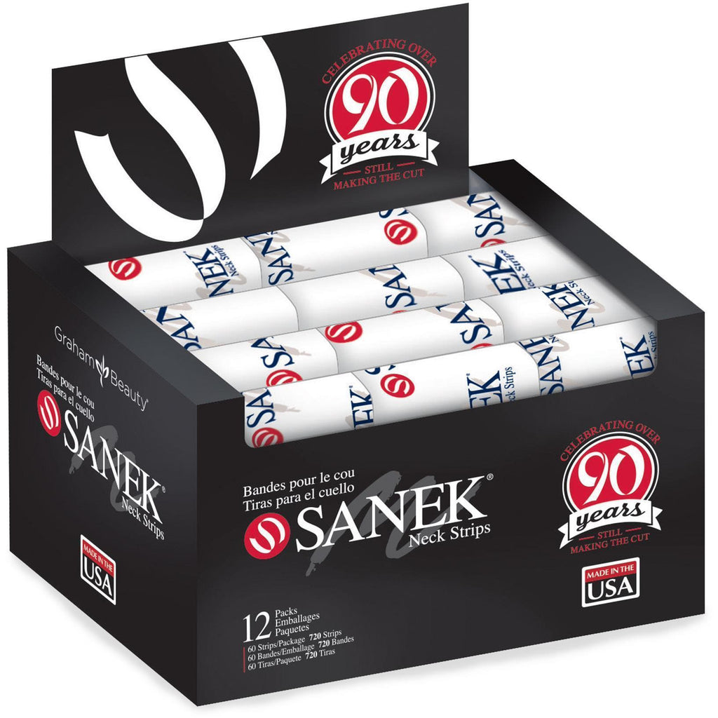 It’s Comfortable, It’s Sanitary, It’s Affordable, and It’s The Law.Made of a soft, highly absorbent, wet strength tissue, SANEK® Neck Strips catch loose hair, absorb perspiration and drips. They stretch to fit around the client’s neck, keeping it clean and comfortable. In most states, neck protection is required to prevent soiled hair-cutting capes from touching the customer’s skin. Compared to paper towels and cloth towels, SANEK neck strips are very economical. 12 packs containing a total of 720 strips.