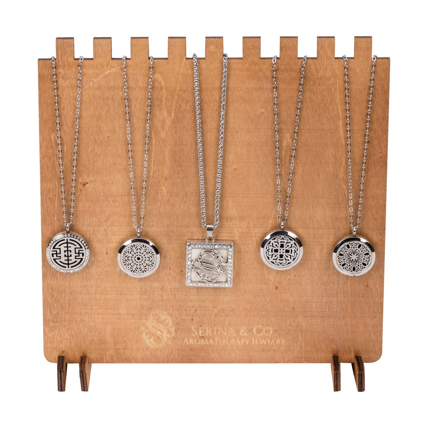 Market your Serina & Company products to your retail clients with this Necklace Display. Created of wood, it provides a natural look.