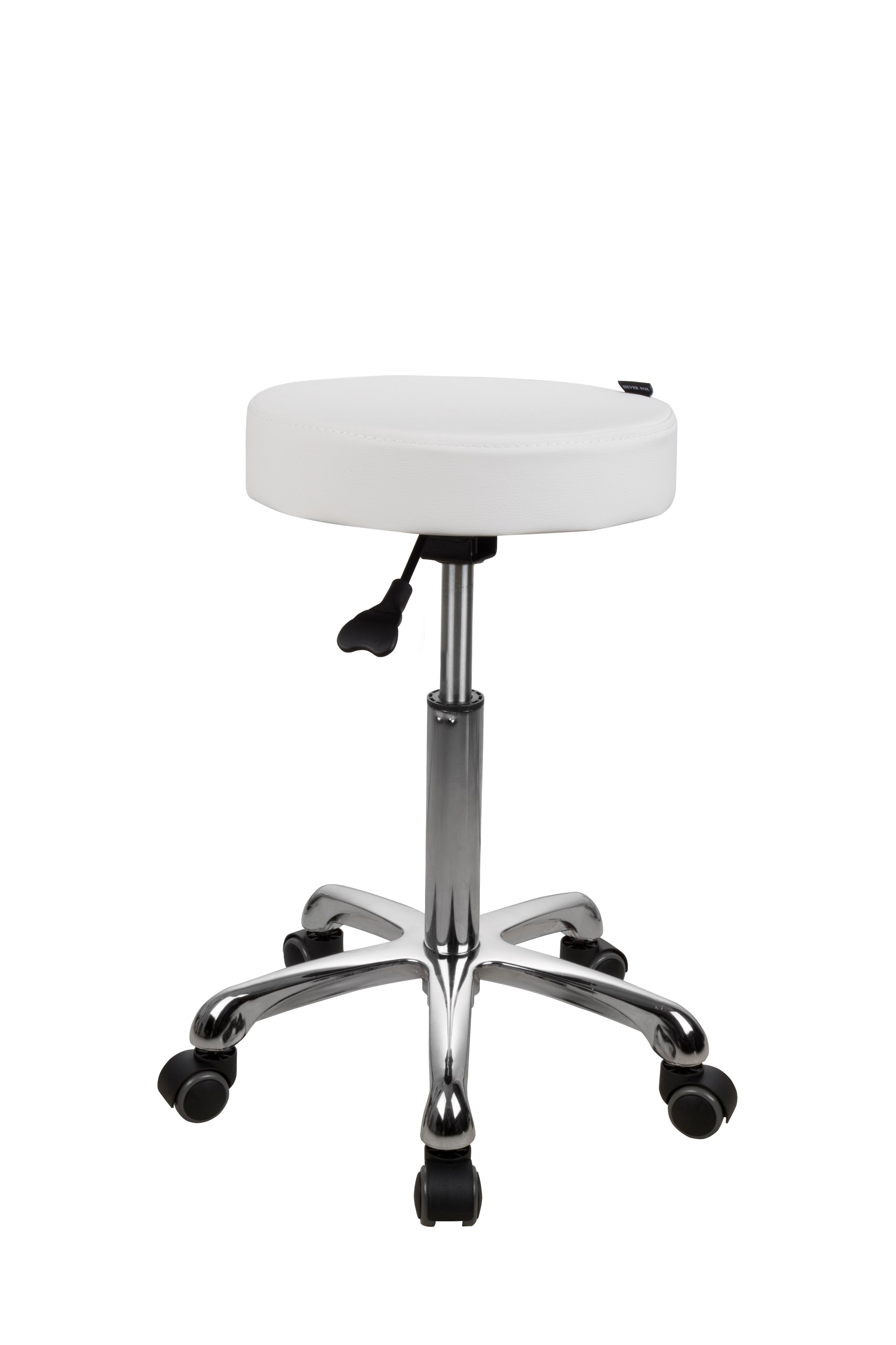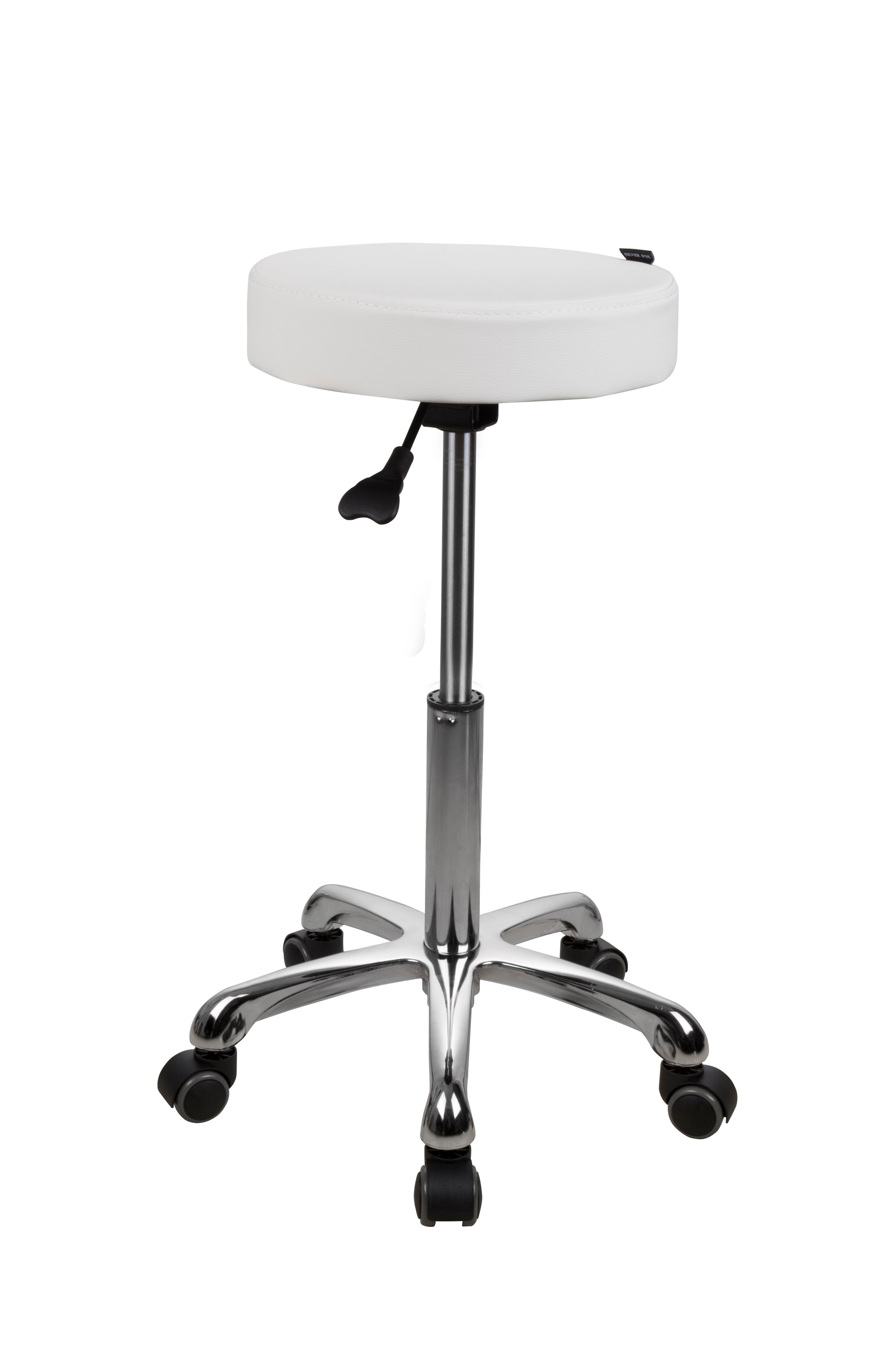 - Silverfox Round Stool – Stay comfortable throughout treatments with an ergonomic, flat-seat design. The gas-lift mechanism offers quick, seamless height changes, supported by a sturdy five-wheel chrome base for stability and mobility.