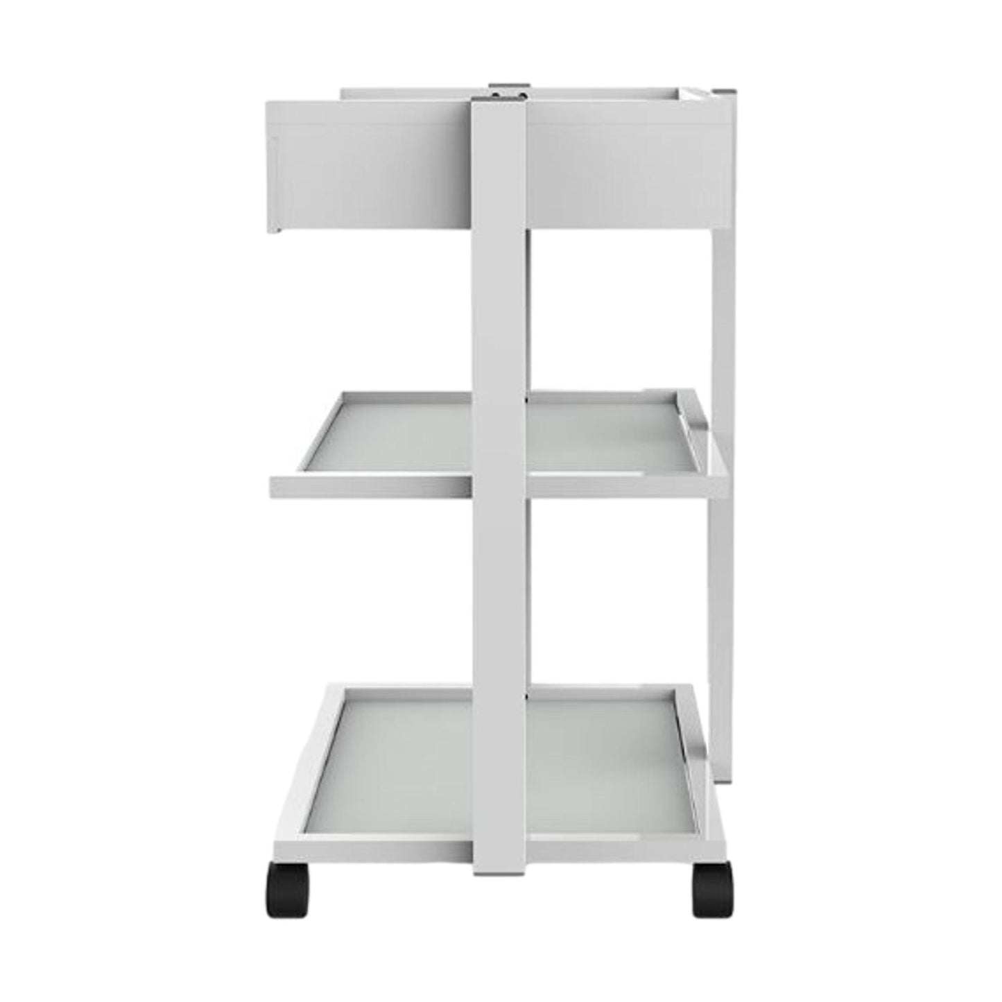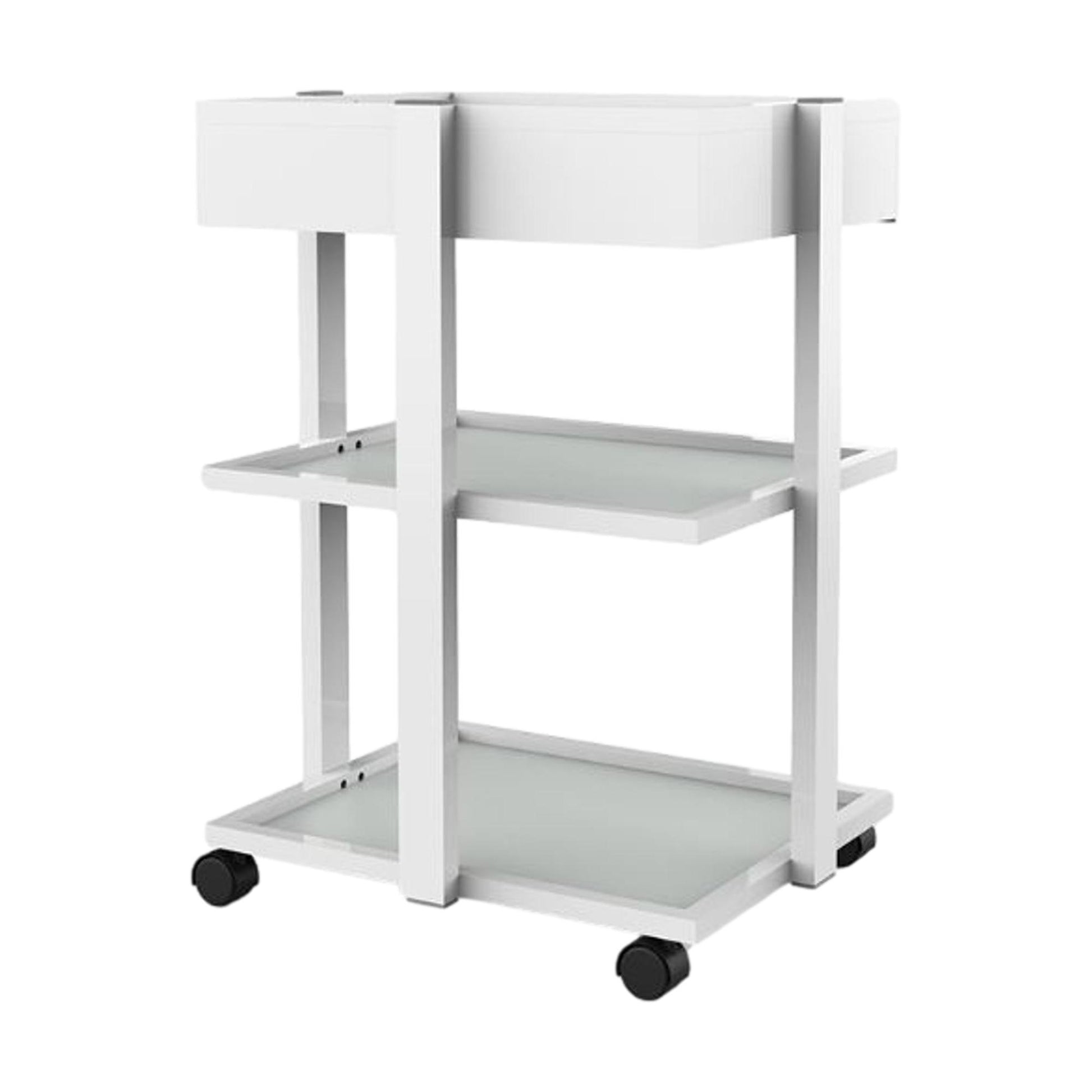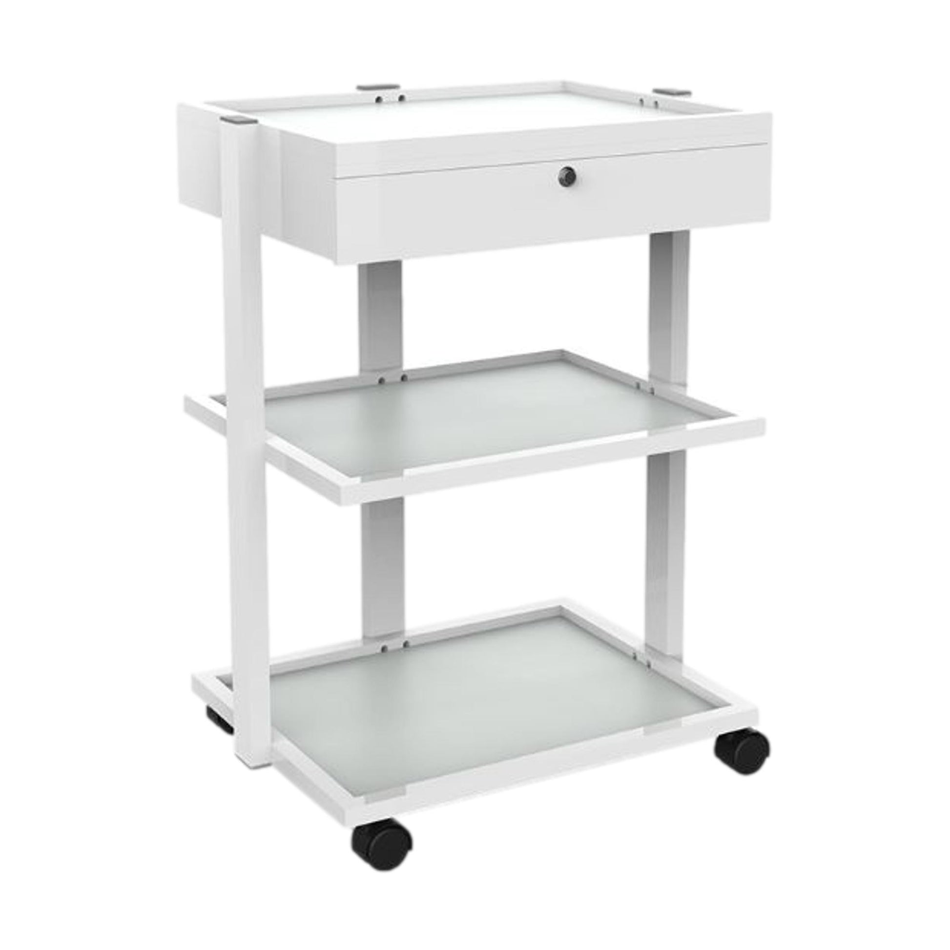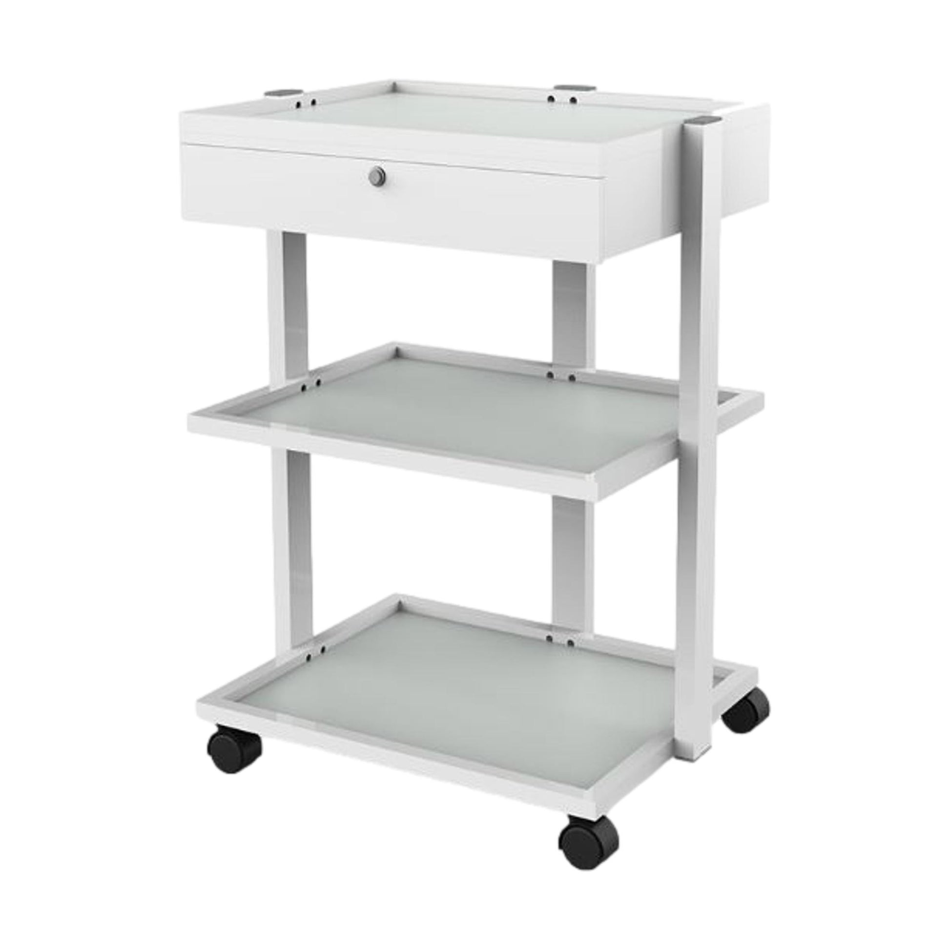 A sleek and durable metal spa trolley featuring three tempered glass shelves for organized product display, a built-in locking storage drawer for discreet tool or supply storage, and smooth-rolling caster wheels for easy mobility around the treatment area. Assembly Required.