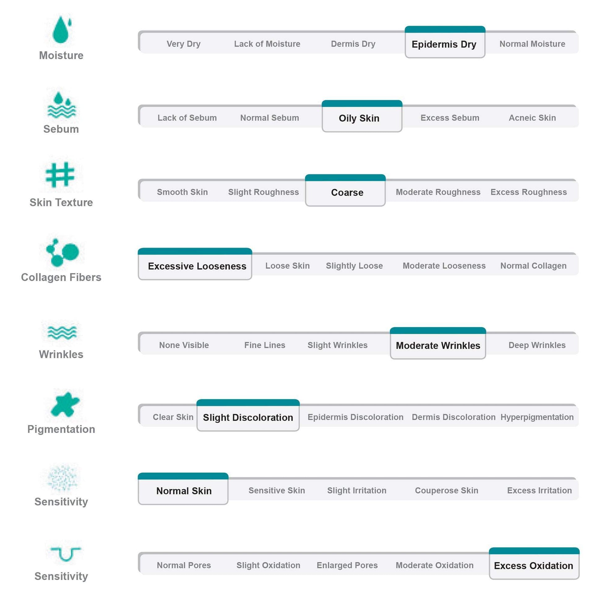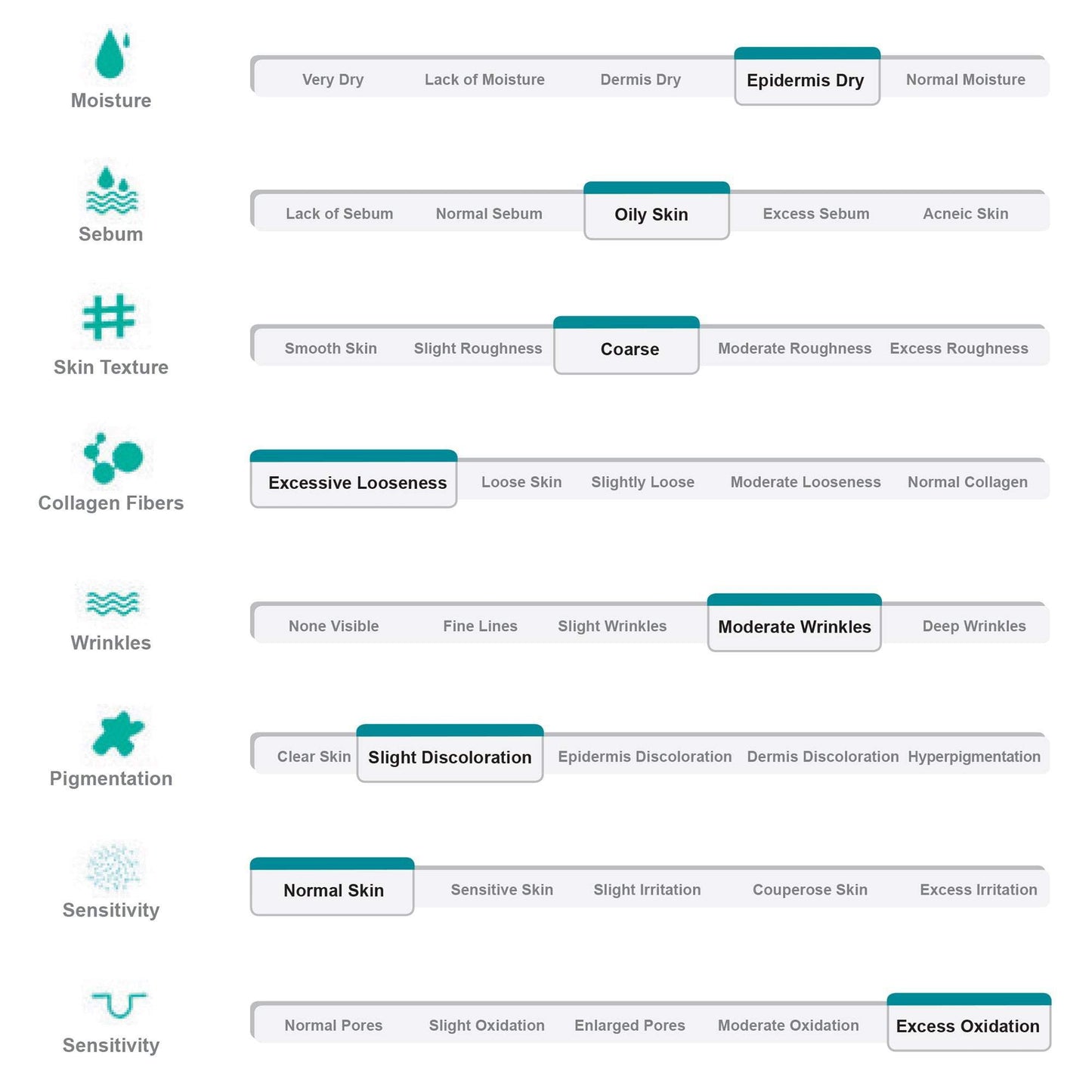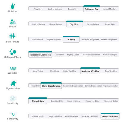 ✔ Comprehensive Skin Assessment – Evaluate sebum and moisture levels, texture, smoothness, irritation, pores, and pigmentation with precision.
