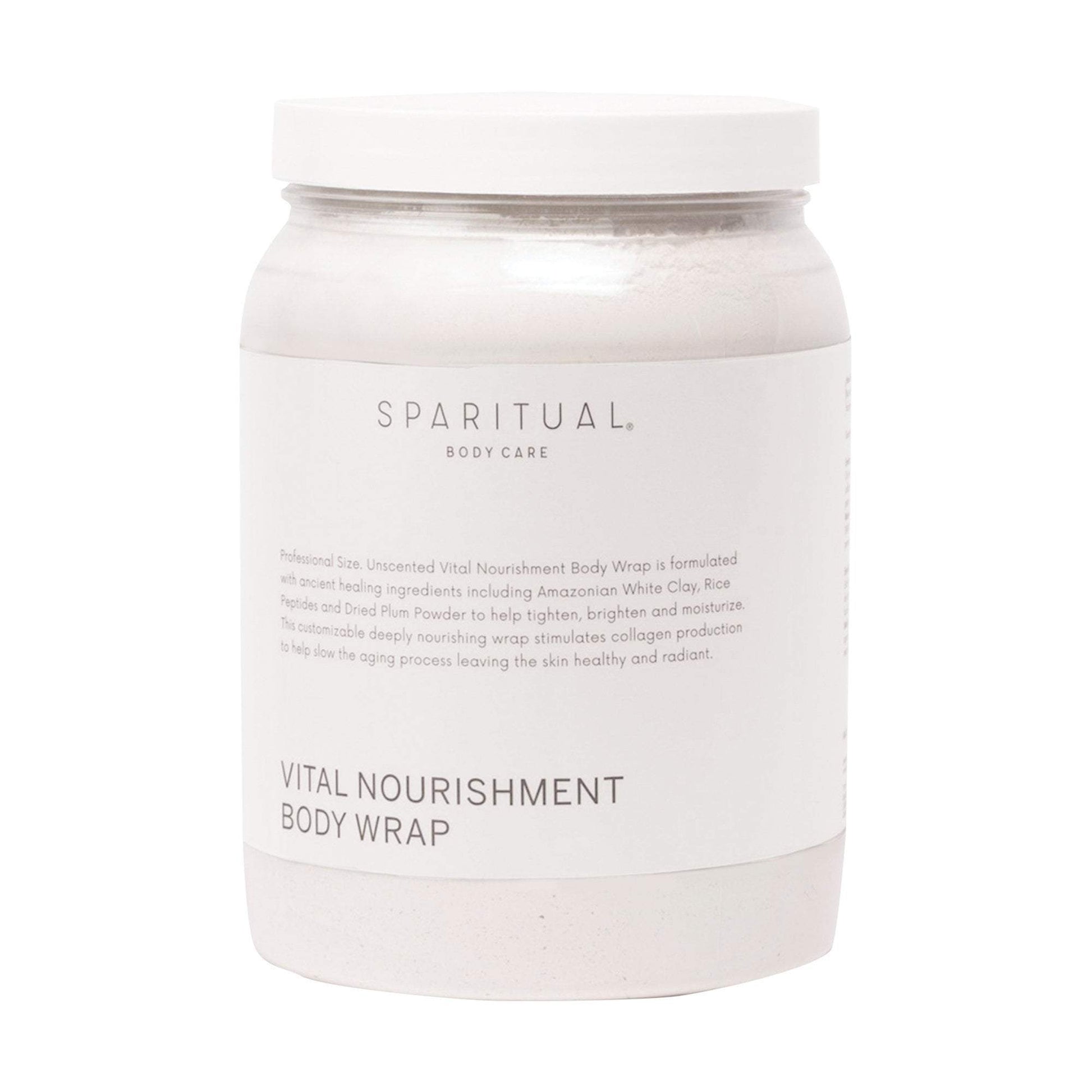 Enrich your clients' rituals with SpaRitual Vital Nourishment Body Wrap. Formulated with Amazonian white clay, rice peptides, and dried plum powder to help tighten, brighten, and moisturize the skin's appearance. This customizable, deeply nourishing wrap helps minimize the look of aging concerns, leaving the skin radiant. Vegan.org and Leaping Bunny certified. Free of parabens, petrochemicals, synthetic fragrance, and dyes. Unscented. For professional use. 35 fl. oz.Ingredients