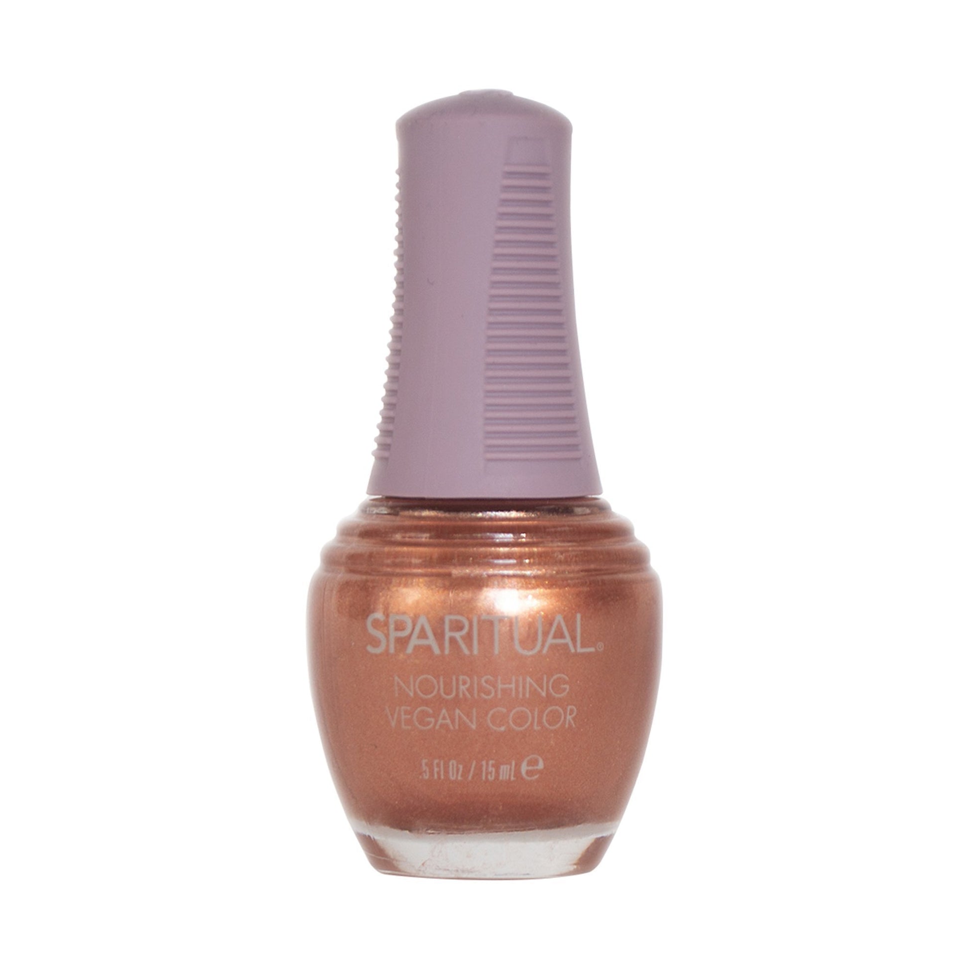 Strengthen, hydrate, and revitalize nails with SpaRitual® Nourishing Vegan Color. Advanced oxygen technology produces a permeable layer for hydration balance in the nails, while red tea and seaweed extracts help nails look brighter and healthier. Formulated with adhesion promoters and shine additives, this all-in-one formula contains the benefits of a treatment, basecoat, color, and topcoat. Non-GMO, 100% vegan, and 13-free. Mindful Brush has over 600 bristles that fan out on the nail for maximum control and precise application. Patented Plum Cap provides easy opening. Vibrant Energy Nourishing Vegan Color is a light copper shimmer. 0.5 fl. oz.