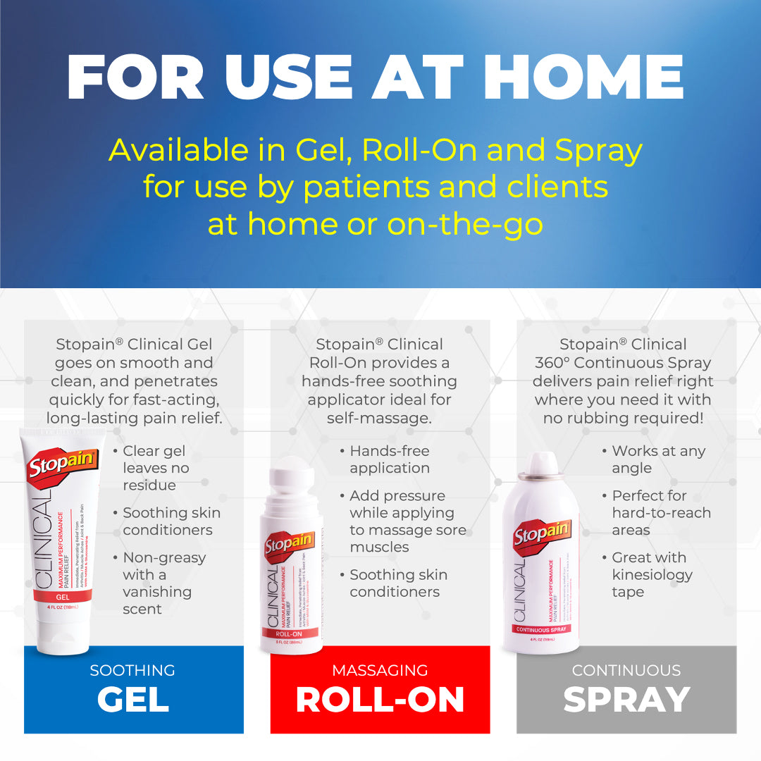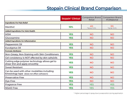 Stopain® Clinical Gel has specially formulated penetration enhancers to provide fast pain relief for your clients. Formulated with 10% menthol plus dimethylsulfone (MSM) and glucosamine, this gel works on contact to provide fast, long-lasting pain relief of sprains, strains, bruises, arthritis, muscle aches, joint, and back pain.